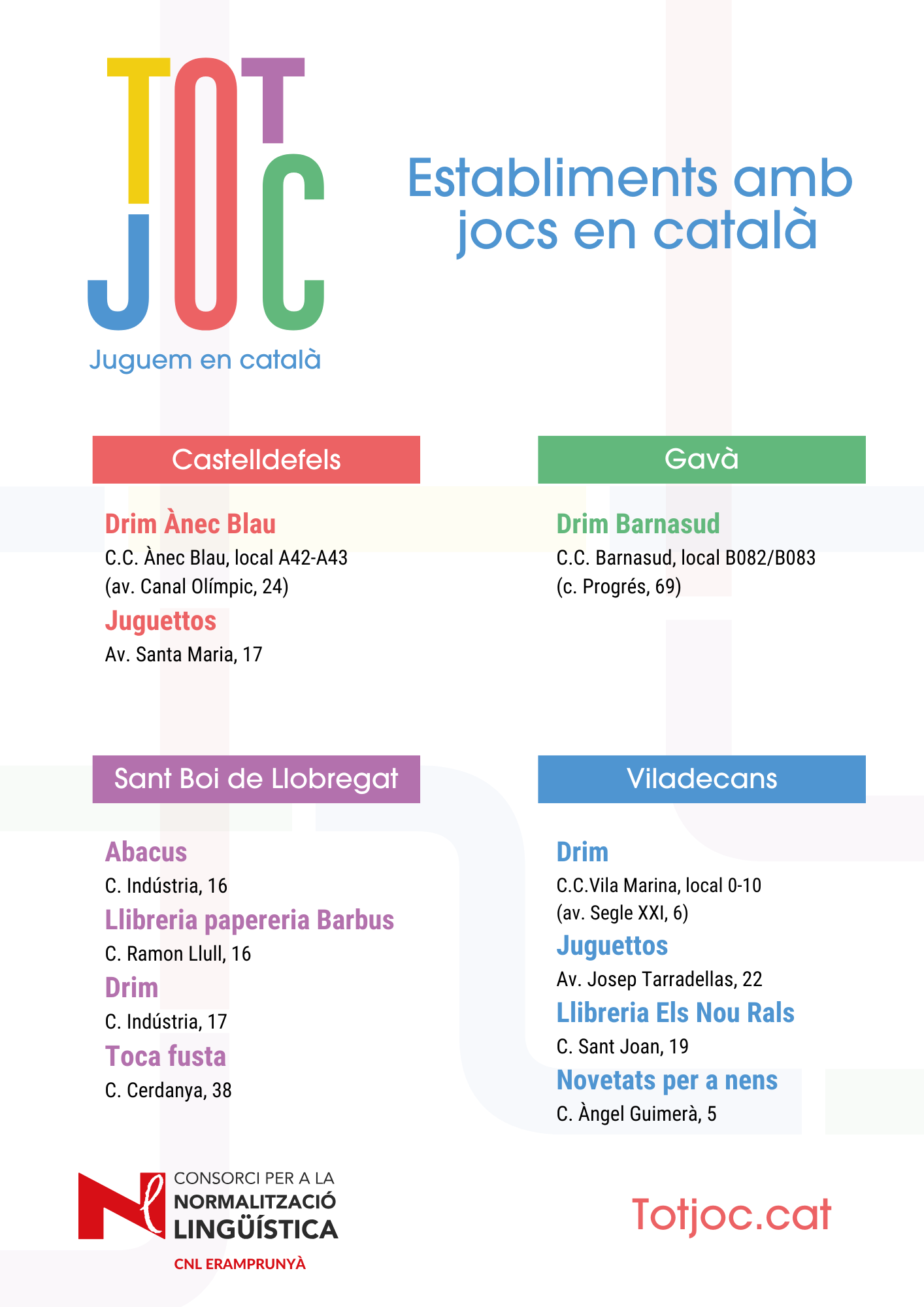 Totjoc és el programa que promou el joc i la joguina en català del Consorci per a la Normalització Lingüística i compta amb una vintena d’empreses col·laboradores, compromeses amb la necessitat de potenciar el català en els seus productes, i més de 400 botigues que tenen jocs en català.