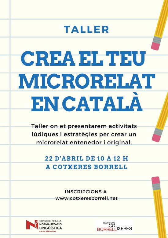 El 22 d'abril, de 10 a 12 h, el Centre de Normalització Lingüística de Barcelona-Delegació de l'Eixample organitza un taller per crear microrelats originals, entenedors i en català, dins de les activitats previstes per Sant Jordi.