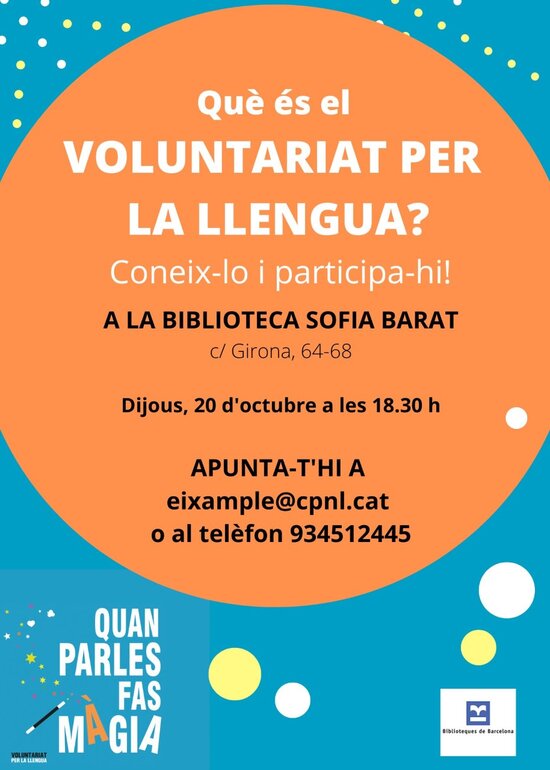 Sessió de benvinguda presencial per a persones que volen començar a participar com a voluntàries o com a aprenents al programa Voluntariat per la llengua. La farem a la Biblioteca Sofia Barat i serà oberta a tothom qui vulgui conèixer el programa del VxL.