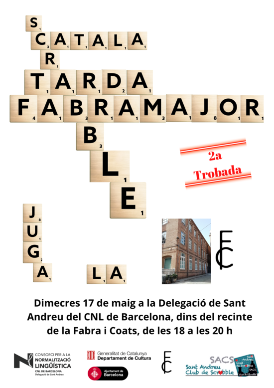 El proper 17 de maig, de 18 a 20 h, jugarem a Scrabble en català a la Delegació de Sant Andreu del CNL de Barcelona. És la segona trobada que es fa a la delegació.