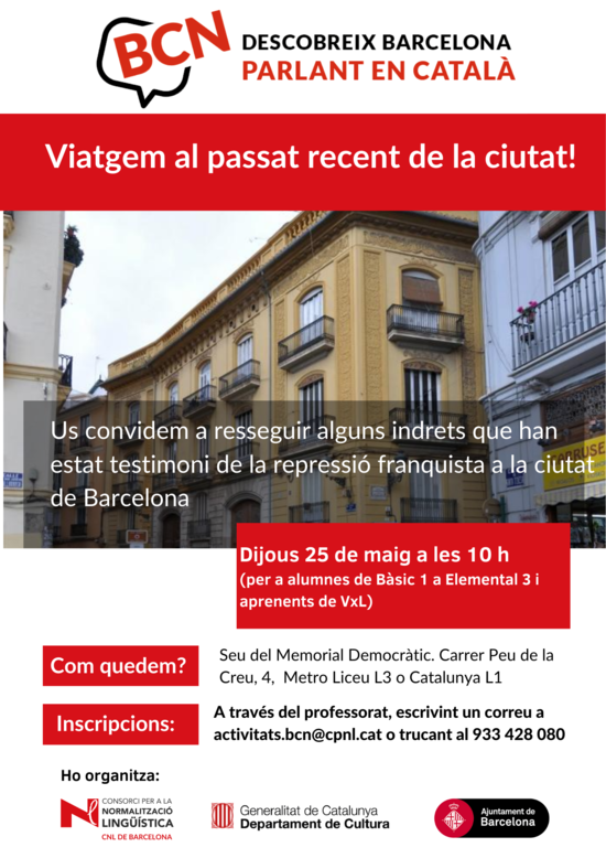 Per inscriure't a l'activitat, cal escriure un missatge a activitats.bcn(ELIMINAR)@cpnl.cat o trucar al 933 428 080.