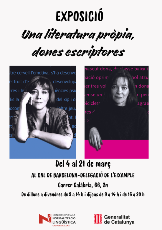 Del 4 al 21 de març, el Centre de Normalització Lingüística de Barcelona-Delegació de l'Eixample acull l'exposició "Una literatura pròpia, dones escriptores" que fa un repàs de les grans escriptores de la literatura catalana de tots els temps, des d'Isabel de Villena fins a Montserrat Roig, passant per Víctor Català, Rodoreda o Capmany.