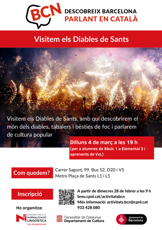 Visitem els Diables de Sants, amb qui descobrirem el món dels diables, tabalers i bèsties de foc i parlarem de cultura popular.