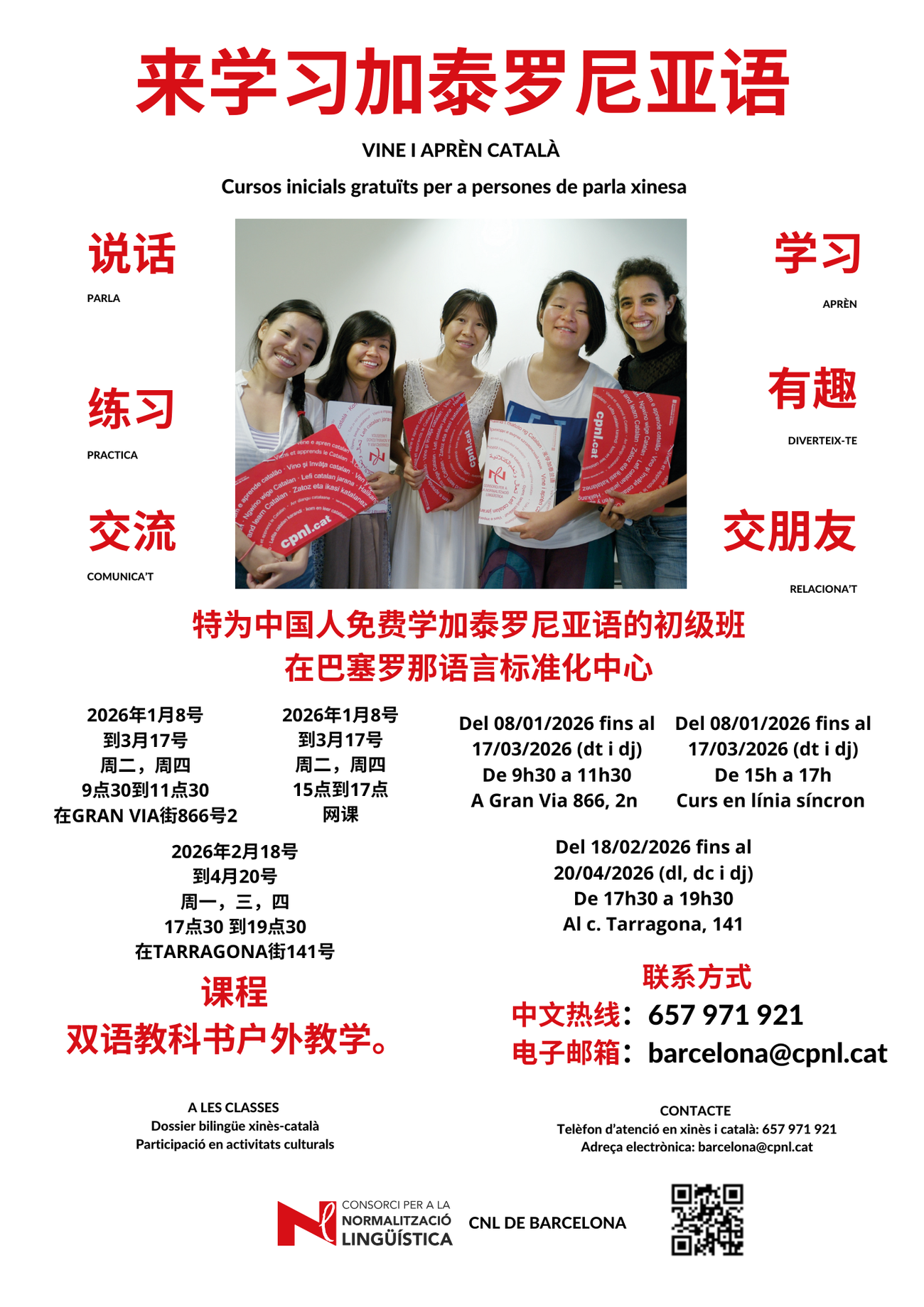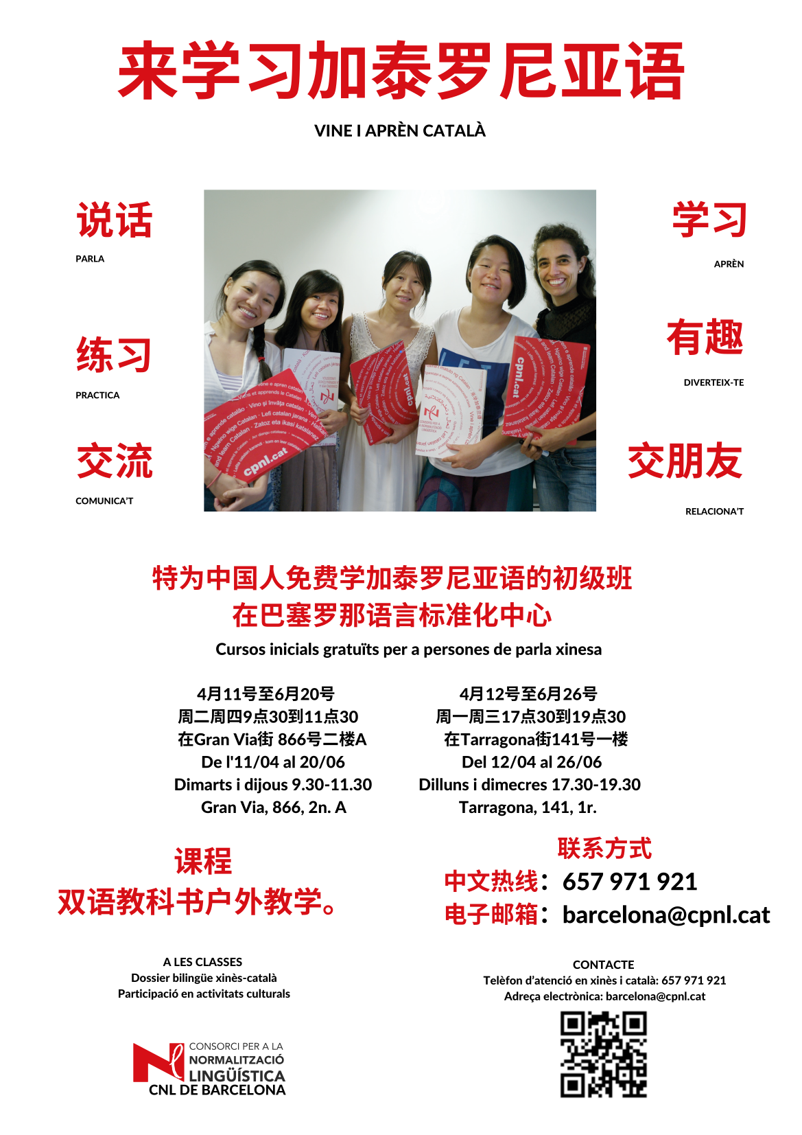Més informació en xinès o en català a l'adreça barcelona@cpnl.cat o bé per telèfon al número 657 971 921.