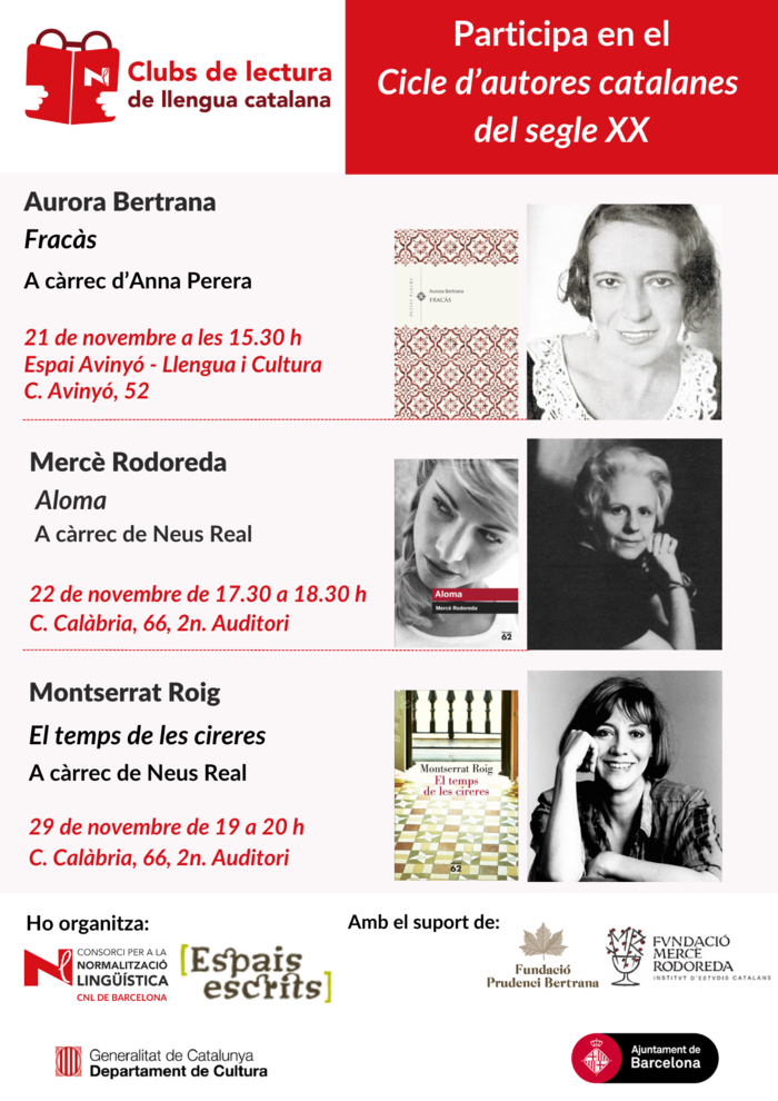 El Centre de Normalització Lingüística (CNL de Barcelona) i l’associació Espai Escrits. Xarxa del Patrimoni Literari Català organitzen un cicle sobre les obres ‘Fracàs’, d’Aurora Bertrana; ‘Aloma, de Mercè Rodoreda’, i ‘El temps de les cireres’, de Montserrat Roig.