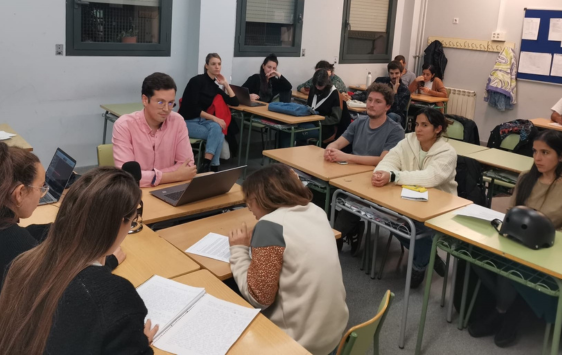 Els alumnes del curs d'Intermedi 1 de la Delegació de Gràcia i Sarrià-Sant Gervasi enregistren un pòdcast a classe.