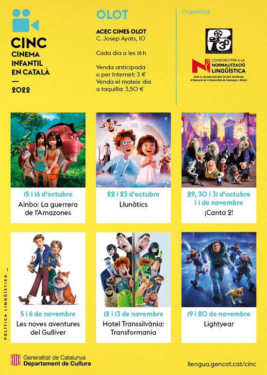 S'inicia un nou cicle CINC de cinema infantil en català. S'han programat sis pel·lícules, que es projectaran de finals d'octubre a finals de novembre, cada cap de setmana, a la sessió de les 16 h, a un preu de 3,5 euros a taquilla i 3 euros si es compra l'entrada anticipadament. Trobareu el programa del CINC a Olot i a la resta de poblacions a: https://gencat.cat/llengua/cinema/cinc.html