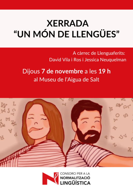 El Museu de l'Aigua de Salt acollirà la presentació d'una nova edició del Voluntariat per la llengua, que comptarà amb la presència de Llenguaferits, en David Vila Ros i la Jessica Neuquelman, que ens parlaran de la diversitat lingüística i de l'ús social del català en la xerrada taller “Un món de llengües” on compartiran curiositats de diverses llengües del món per fomentar alhora la sensibilitat lingüística.