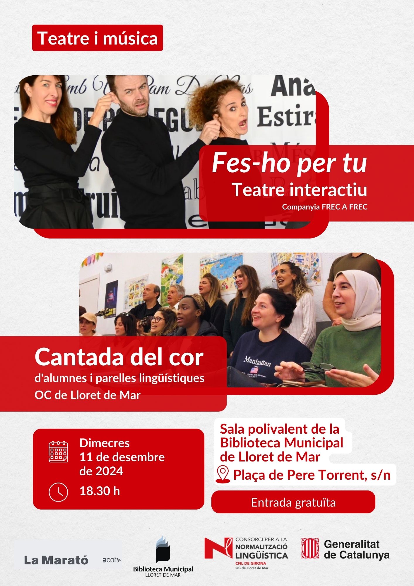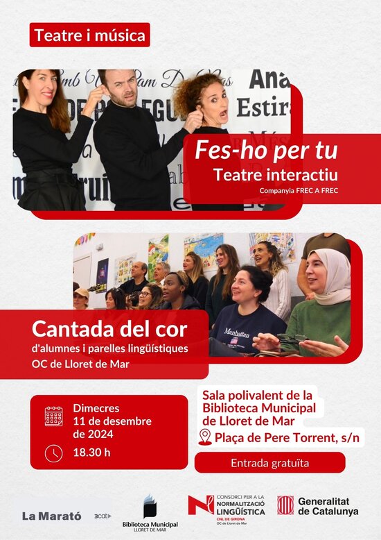 El dimecres 11 de desembre al vespre, arriba a la sala polivalent de la Biblioteca Municipal de Lloret de Mar, l’espectacle participatiu Fes-ho per tu!, de la companyia Frec a Frec, amb el suport del Departament de Política Lingüística de la Generalitat de Catalunya. L'activitat forma part de la campanya Provem-ho en català. Molt per parlar. Molt per viure, que té per objectiu fomentar els usos lingüístics interpersonals.