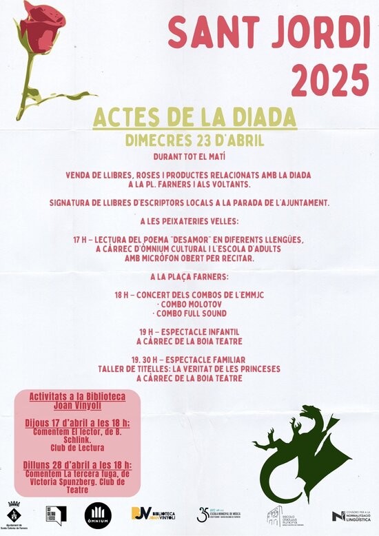 Amb motiu de la diada de Sant Jordi, alumnes dels cursos de català del CPNL i persones que participen en el programa Voluntariat per la llengua prendran part en la lectura del poema “Desamor”, de Josep M. Llompart, en llengües diverses. L’acte, organitzat per l’Ajuntament de Santa Coloma de Farners i Òmnium Cultural, tindrà lloc a la plaça de les Peixateries Velles a les 5 de la tarda.