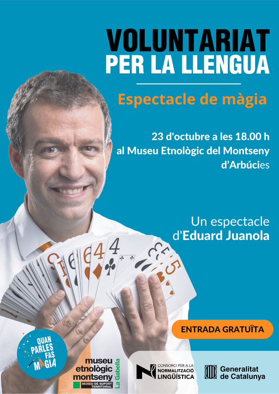 L'Oficina de Català d'Arbúcies convida alumnes, participants del programa Voluntariat per la llengua (VxL) i tots els arbuciencs a l'espectacle, que tindrà lloc el 23 d'octubre a les 18 h, al Museu Etnològic del Montseny, La Gabella.