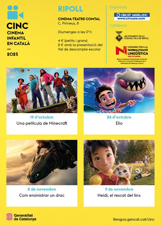 La programació a Ripoll és: Una pel·lícula de Minecraft (19 d’octubre), Elio (26 d’octubre), Com ensinistrar un drac (2 de novembre) i Heidi, el rescat del linx (9 de novembre). Les pel·lícules es projectaran al Cinema Teatre Comtal de Ripoll, a les 17.00 h.