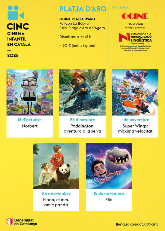 El CINC de tardor oferirà 5 pel·lícules a l’OCINE de Platja d’Aro per al públic infantil: Norbert, el 18 d'octubre; Paddington: aventura a la selva; el 25 d'octubre; Super Wings: màxima velocitat, l'1 de novembre; Moon, el meu amic panda, el 8 de novembre, i Elio, el 15 de novembre.