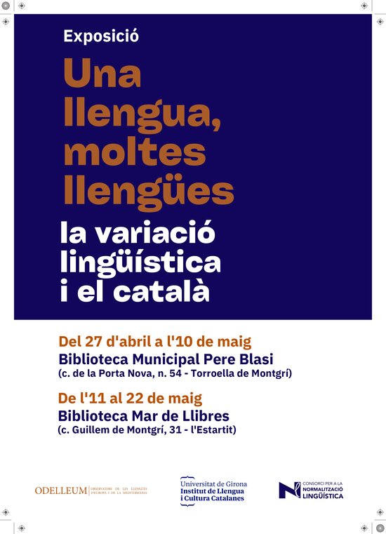 L'exposició “Una llengua, moltes llengües” arriba a les biblioteques de Torroella de Montgrí (27 d'abril-10 maig) i l'Estartit (11-22 de maig). Aquesta mostra proposa un petit recorregut per conceptes clau com què és una llengua, la diversitat lingüística, la vitalitat de les llengües i la variació lingüística. També aborda aspectes com la norma, l'estàndard i els registres. Aquesta exposició ha estat elaborada per l'Observatori de les Llengües d'Europa i de la Mediterrània (ODELLEUM), organisme vinculat a la Universitat de Girona.