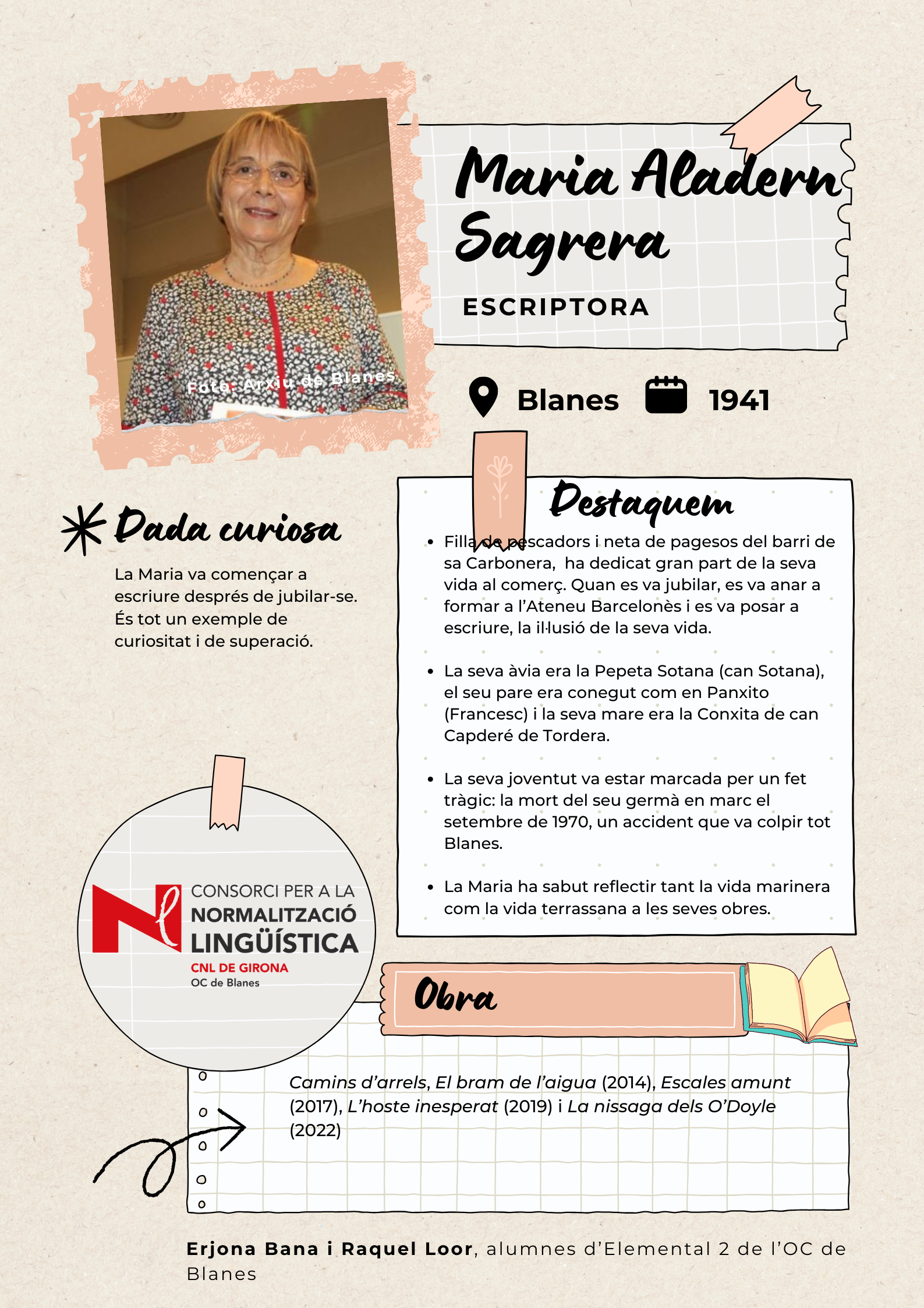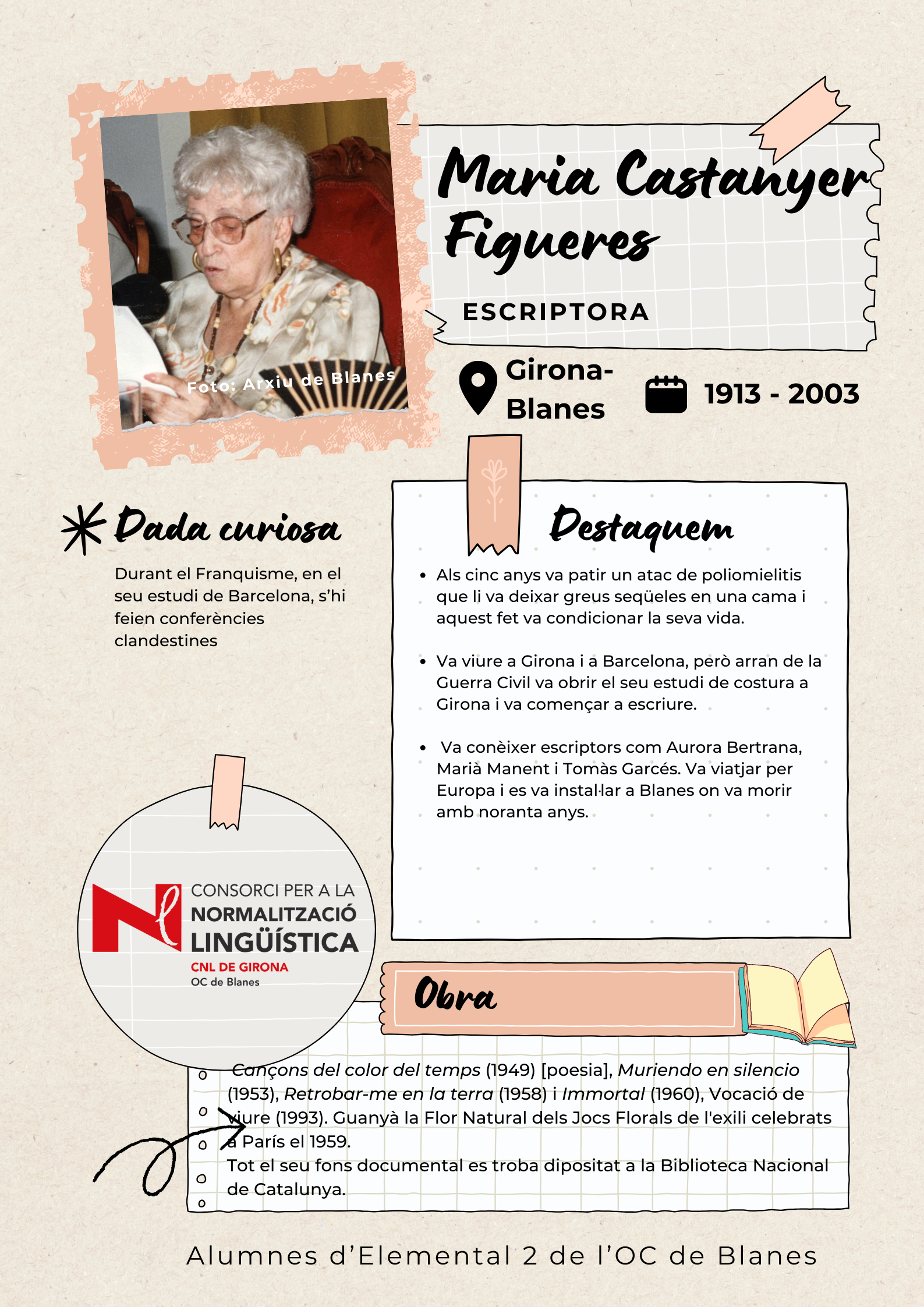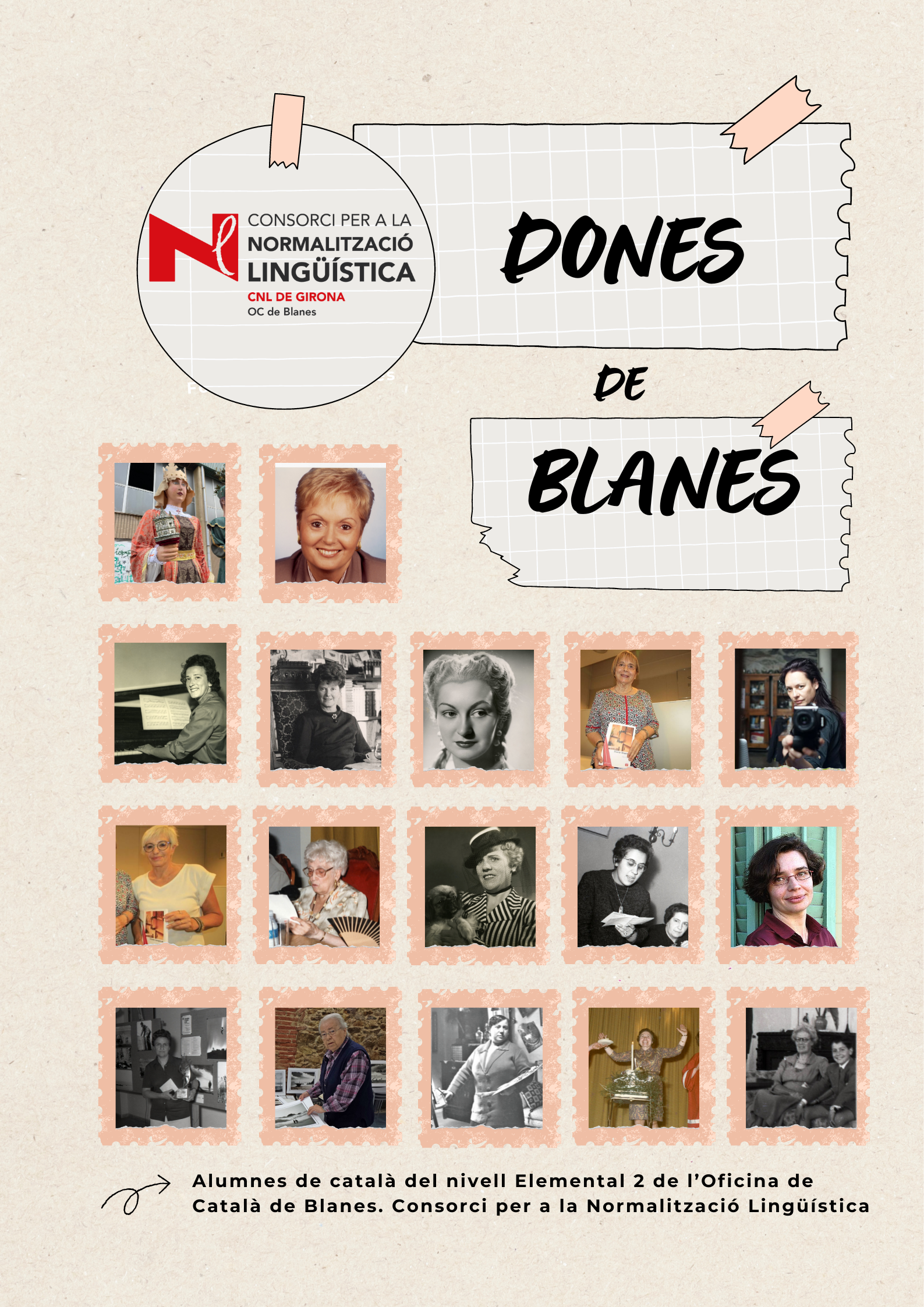 Amb l'objectiu de visibilitzar les dones de Blanes, els alumnes de català del nivell Elemental 2 de Blanes han elaborat uns pòsters per divulgar la tasca de 17 dones del municipi de totes les èpoques, des de la vescomtessa Violant de Prades (s. XV), que va fer construir la font gòtica, fins a pintores, actrius, escriptores, músiques i polítiques.