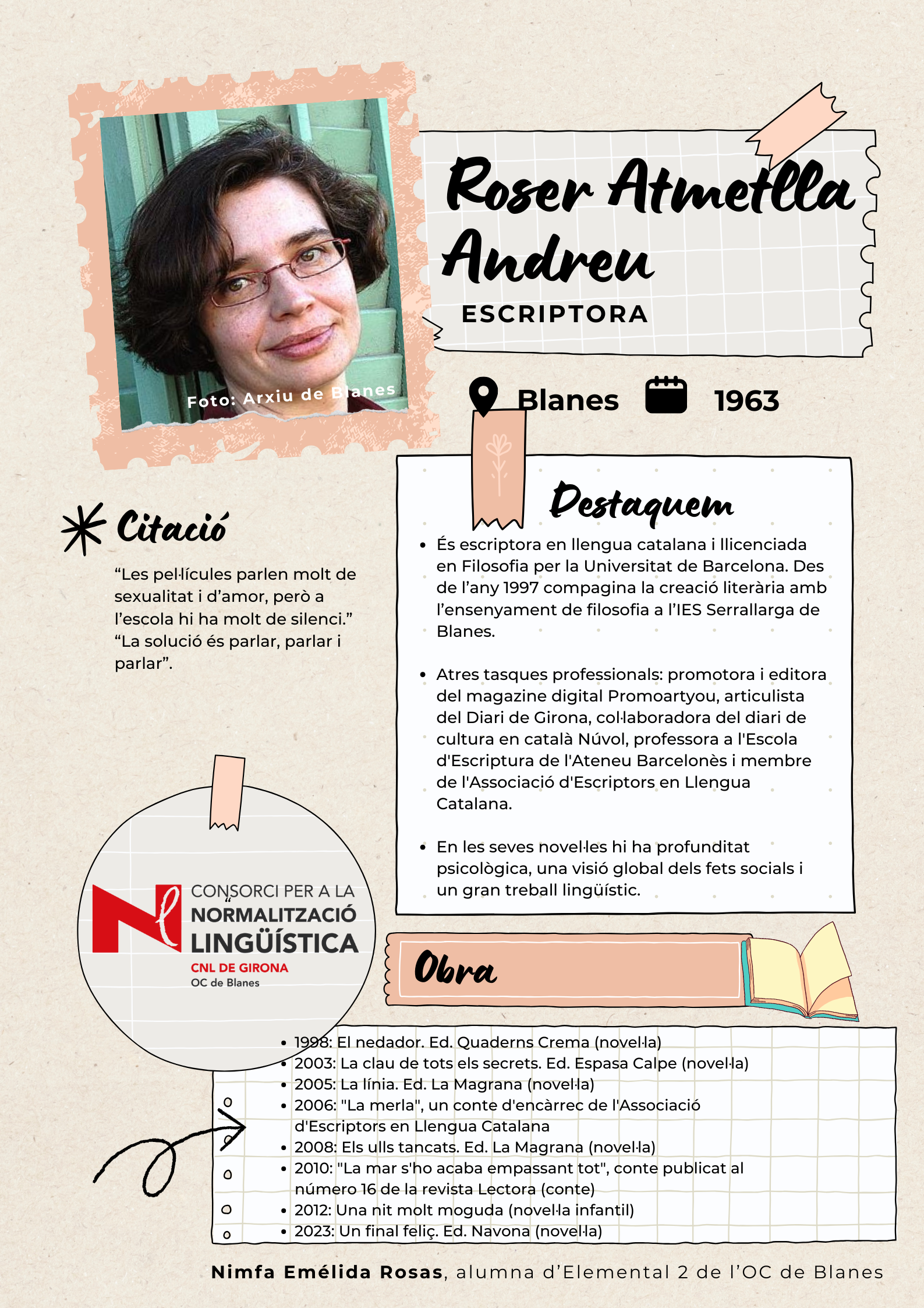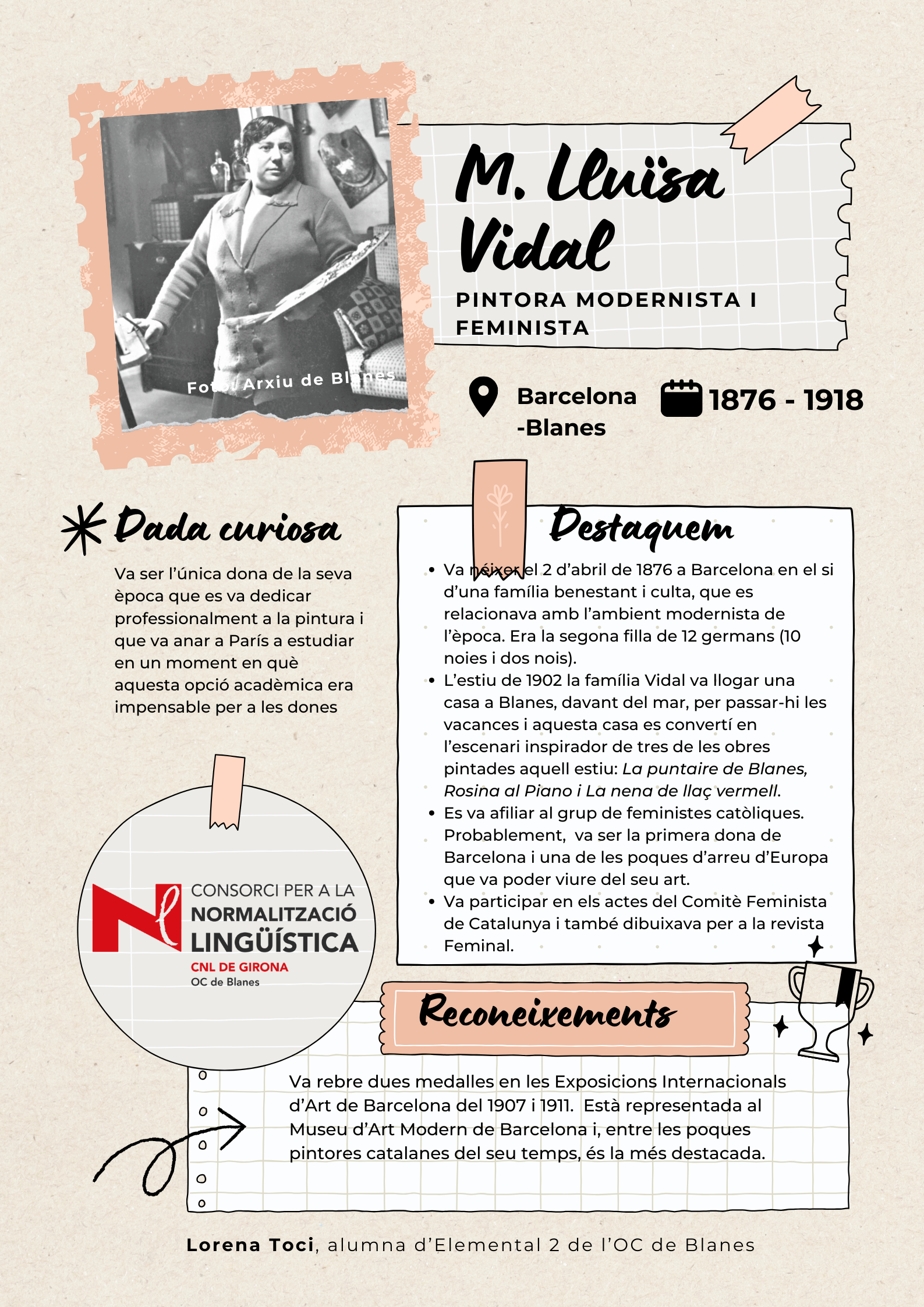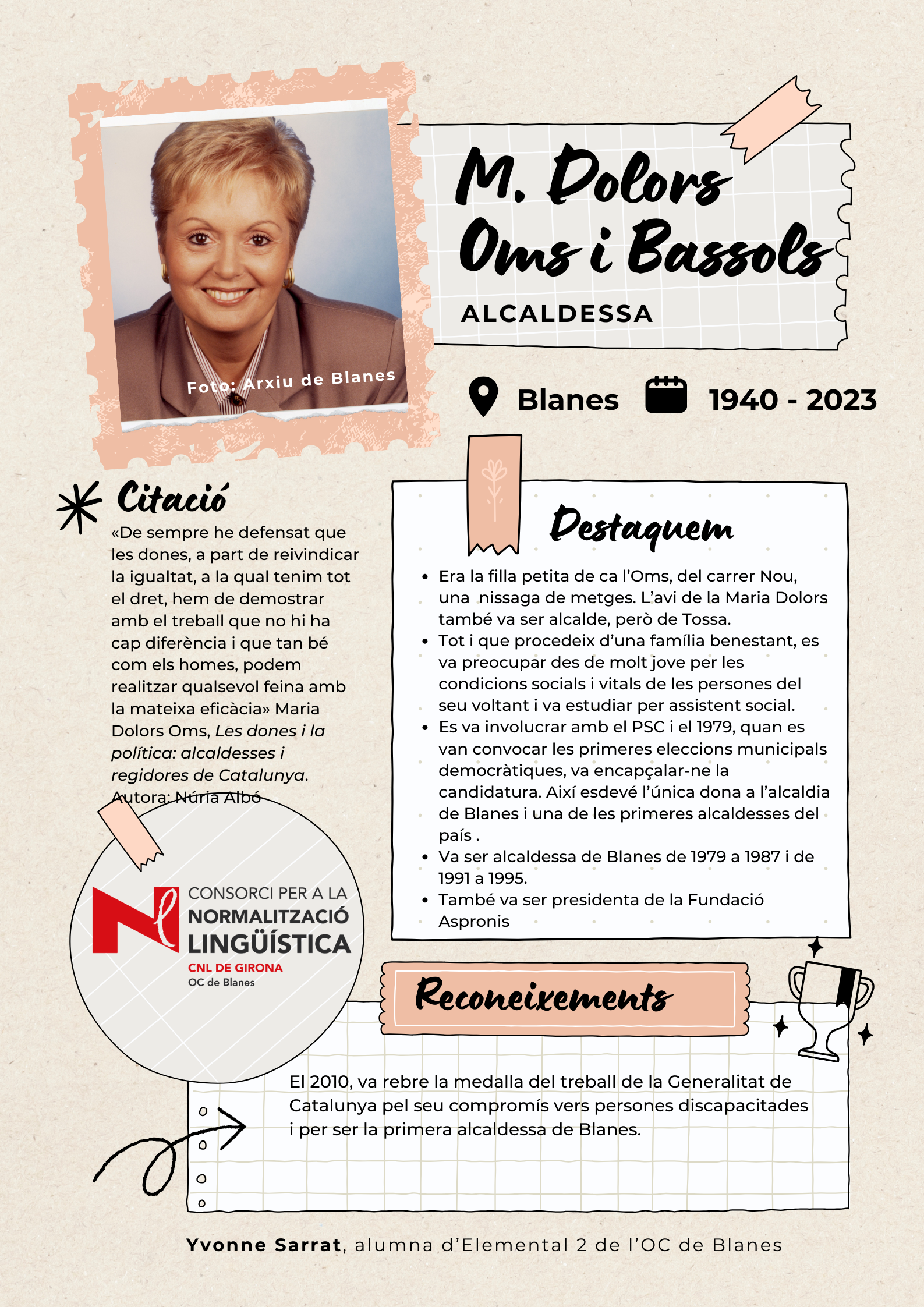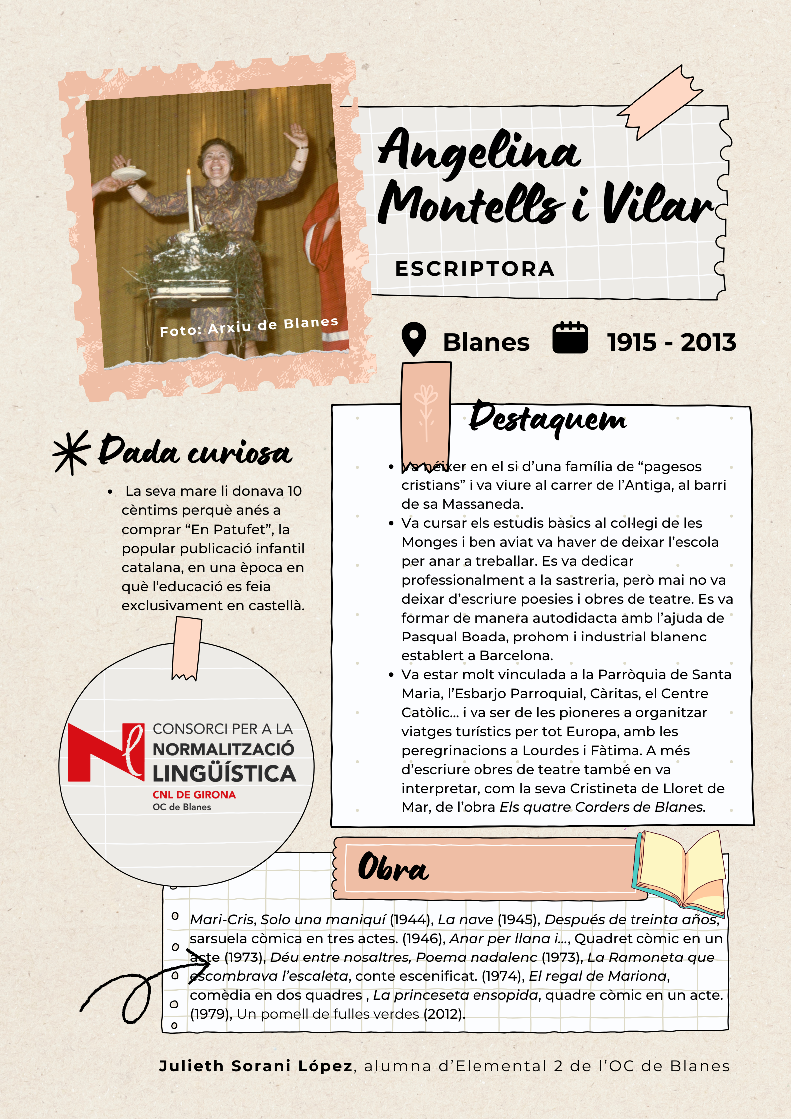 Amb l'objectiu de visibilitzar les dones de Blanes, els alumnes de català del nivell Elemental 2 de Blanes han elaborat uns pòsters per divulgar la tasca de 17 dones del municipi de totes les èpoques, des de la vescomtessa Violant de Prades (s. XV), que va fer construir la font gòtica, fins a pintores, actrius, escriptores, músiques i polítiques.