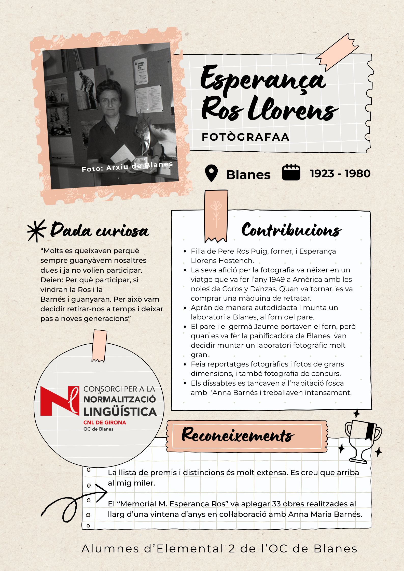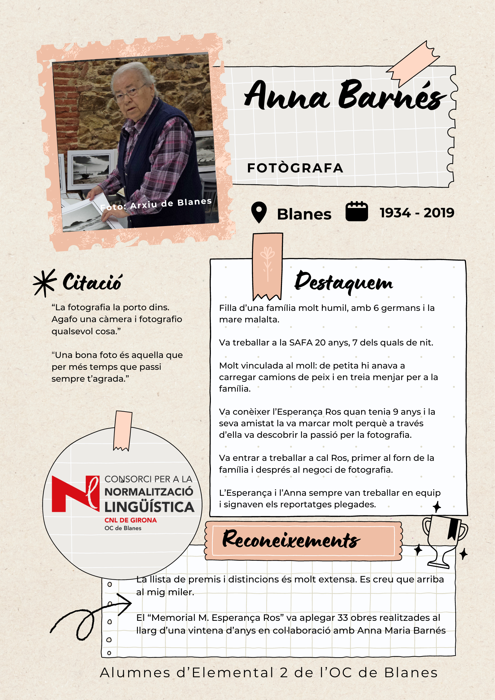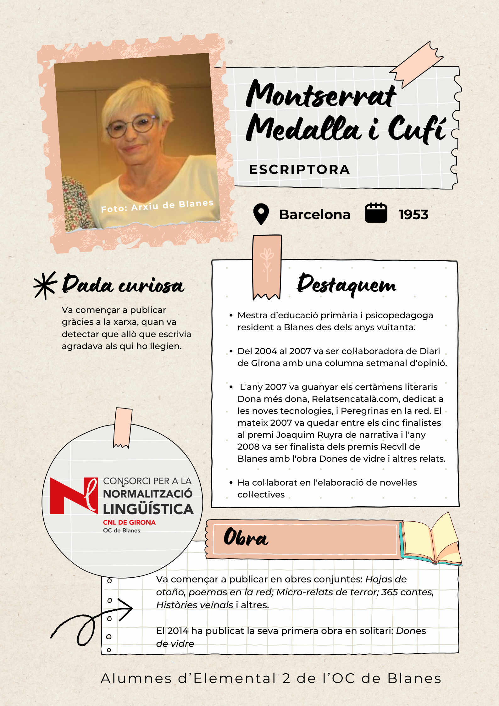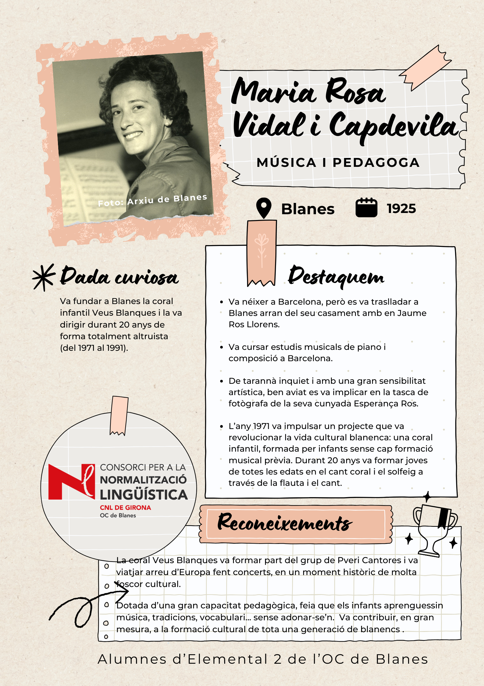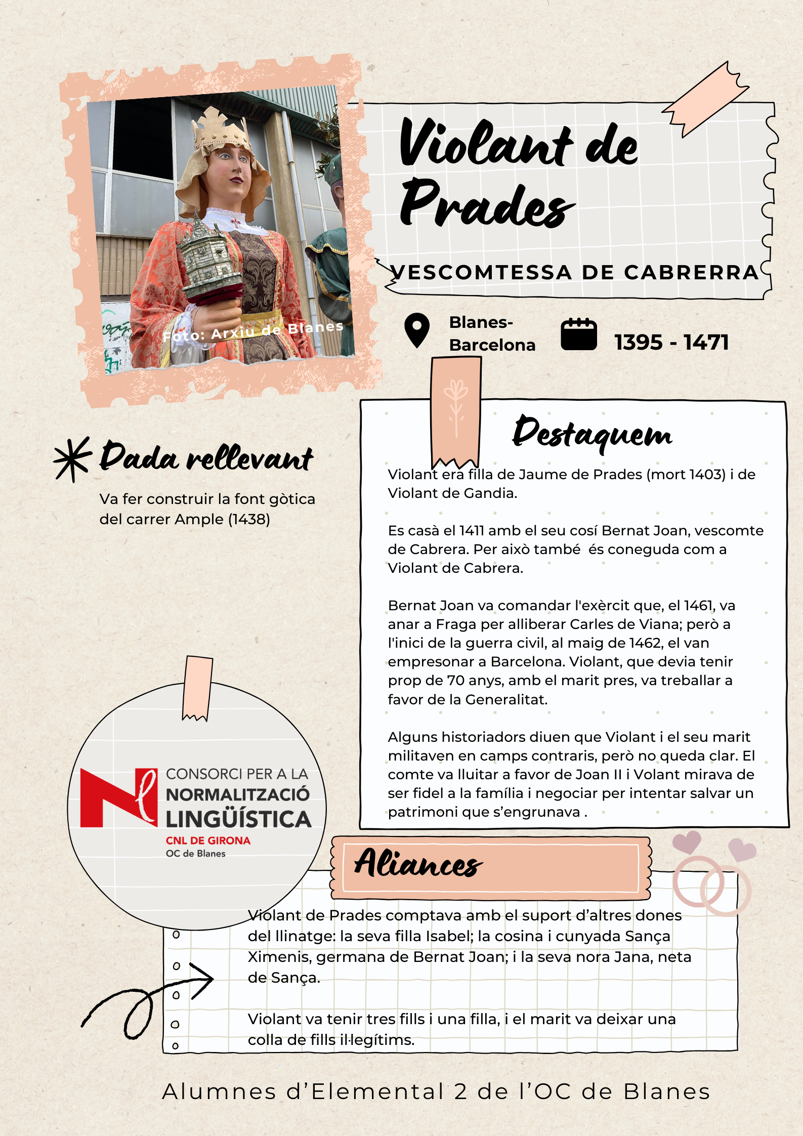 Amb l'objectiu de visibilitzar les dones de Blanes, els alumnes de català del nivell Elemental 2 de Blanes han elaborat uns pòsters per divulgar la tasca de 17 dones del municipi de totes les èpoques, des de la vescomtessa Violant de Prades (s. XV), que va fer construir la font gòtica, fins a pintores, actrius, escriptores, músiques i polítiques.