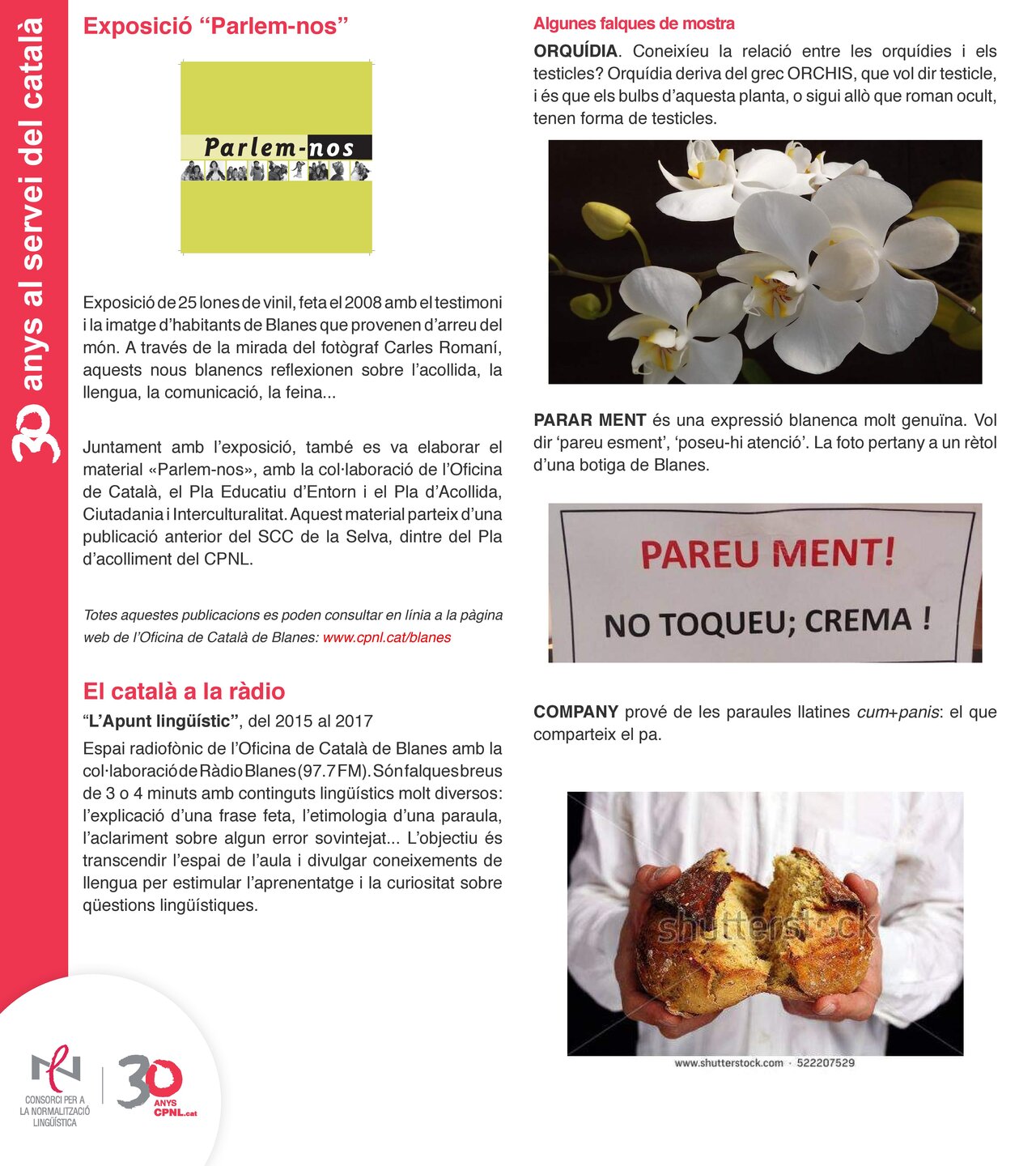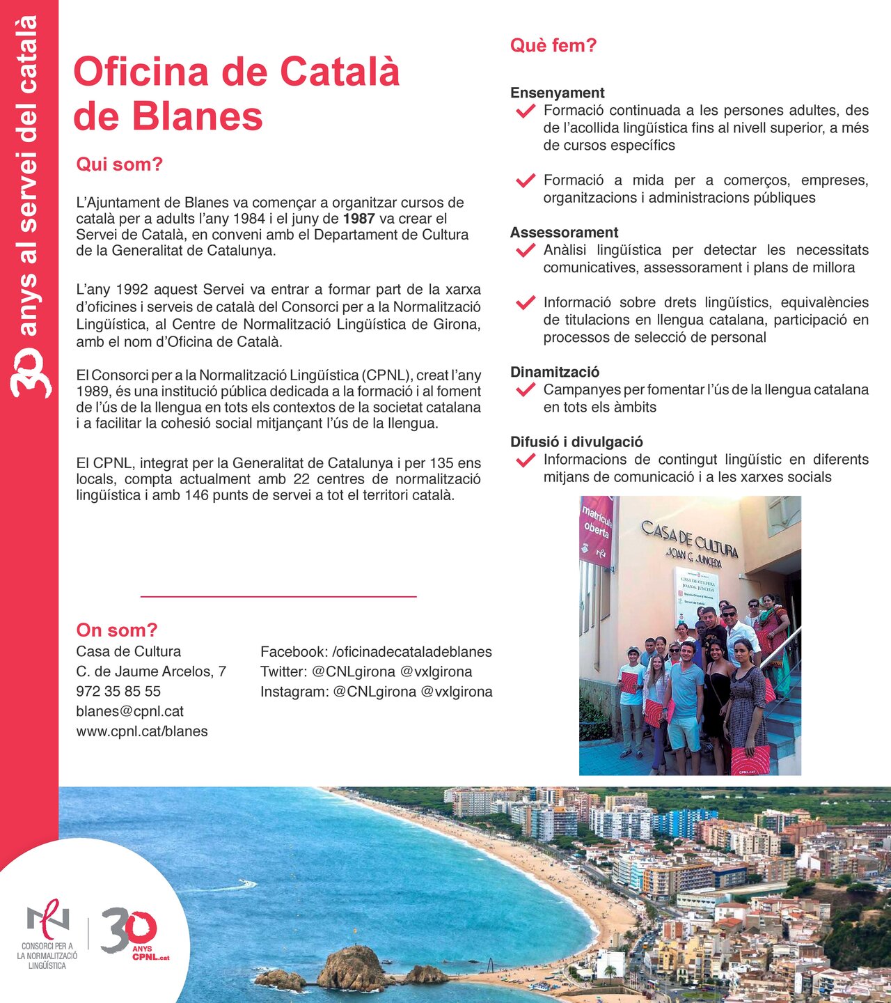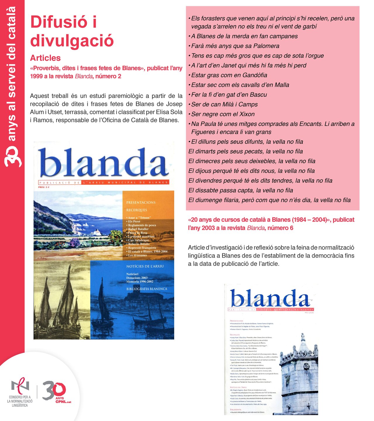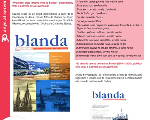 Amb motiu dels 30 anys de servei, l’Oficina de Català de Blanes va publicar un article a la revista de l’Arxiu Municipal Blanda, que resumeix la trajectòria d’aquest servei al llarg dels seus primers 30 anys (1987-2007): més de 17.000 alumnes i 650 cursos de català, a més d’activitats i materials de divulgació lingüística, i va elaborar una exposició amb 22 plafons, que es va dur a terme el març de 2018 en el marc de l’Any Pompeu Fabra.
