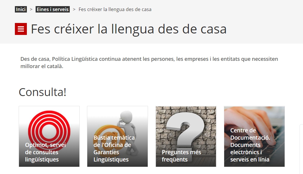Si durant aquest període vols fer pràctiques i activitats per aprendre'n més tens a disposició aquest recull de recursos d'aprenentatge en línia o recursos lingüístics de consulta. Els dos últims fan referència a l’Optimot, el Termcat i l’ésAdir.