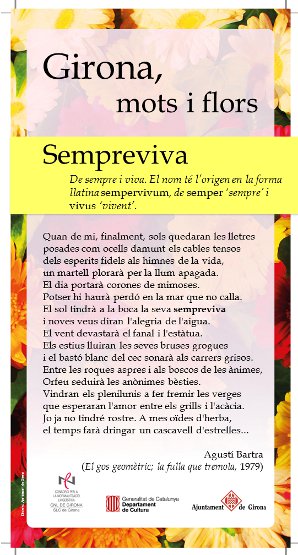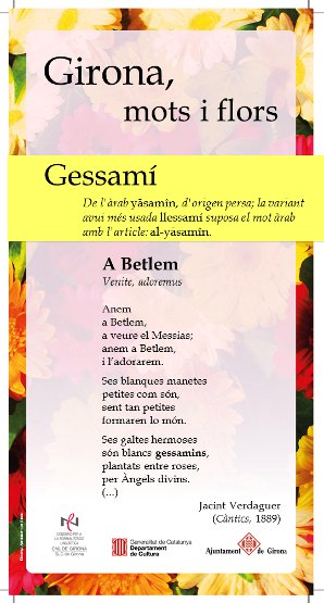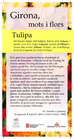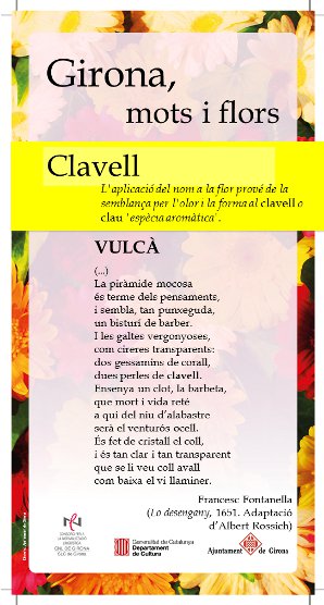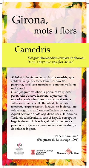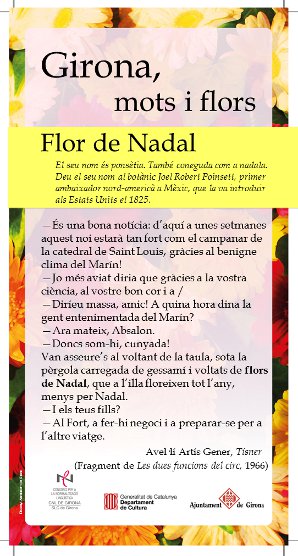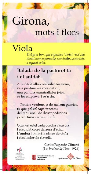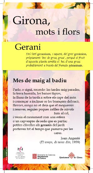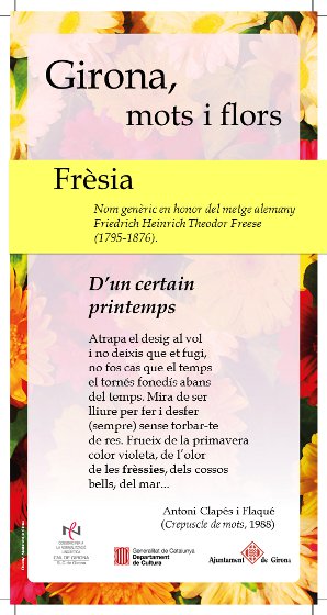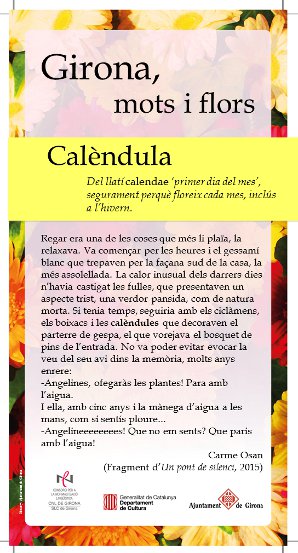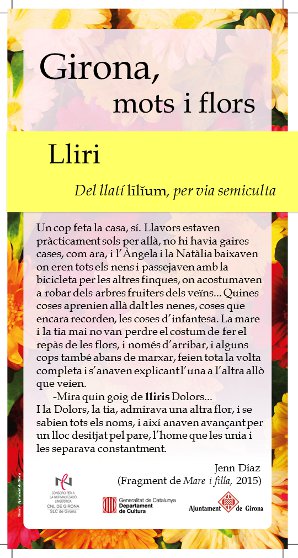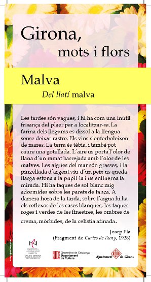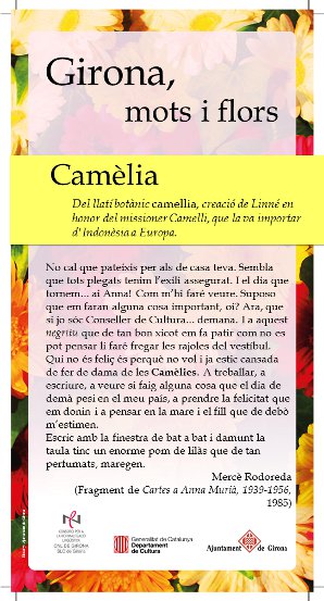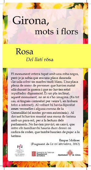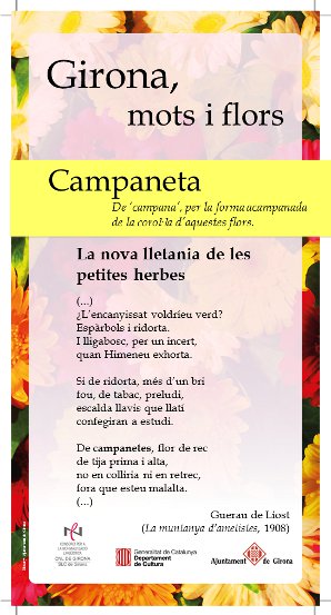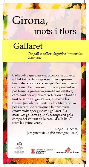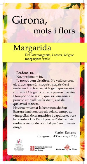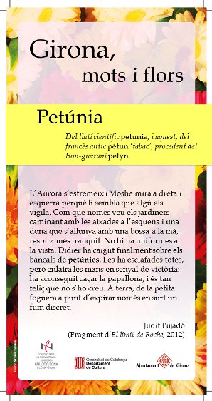 Els cartells i punts de llibre tenen el nom d'aquestes flors, la seva etimologia i un fragment literari que les il·lustra. Autors dels països catalans de diverses èpoques en són els protagonistes: Carles Fages de Climent, Maria Aurèlia Capmany, Agustí Bartra, Empar Moliner, Judit Pujadó, Carles Rebassa, Josep Pla, Jenn Díaz, Quim Monzó, Jacint Verdaguer, Joan Argenté, Màrius Torres, Najat El Hachmi, Antoni Clapés i Flaqué, Avel·lí Artís Gener, Pompeu Fabra, Francesc Fontanella, Guerau de Liost, Mercè Rodoreda, Isabel-Clara Simó i Carme Osan.
