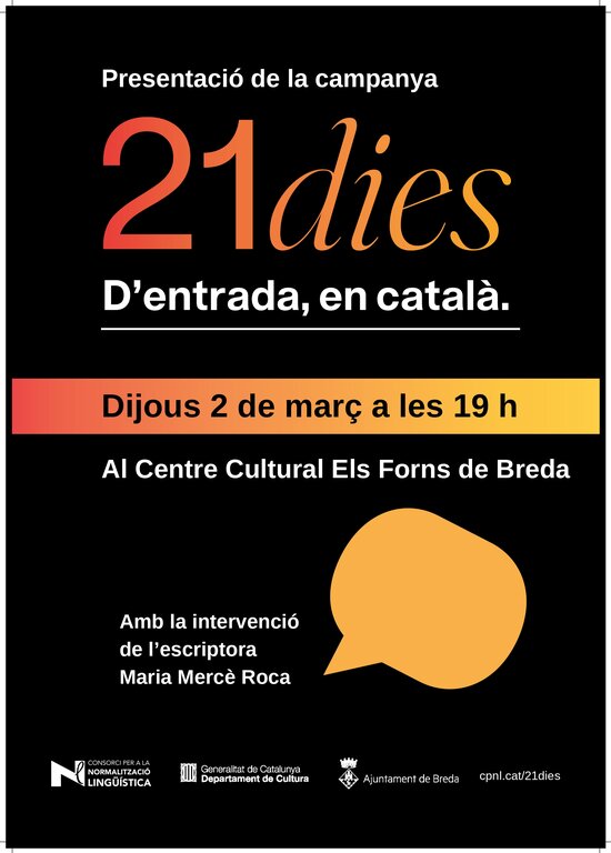 La campanya "21 dies. D'entrada en català" ha arribat a Breda, on es durà a terme durant el mes de març. El repte que es proposa als ciutadans de Breda: mantenir el català sempre, a tot arreu i amb tothom.