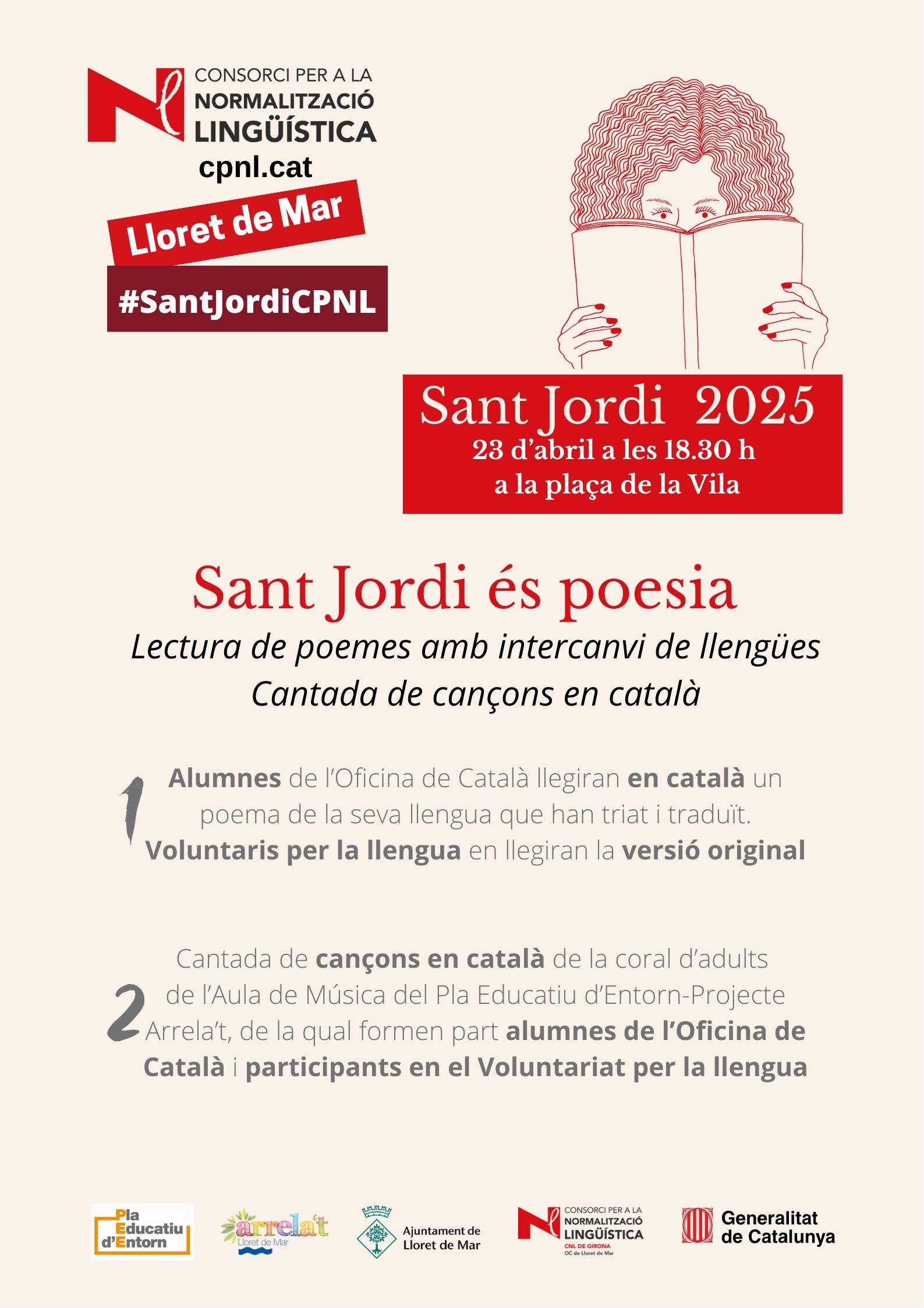 Aprenents de català han triat poemes en la seva llengua materna i els han traduït al català. Avui, dia de Sant Jordi, a la plaça de la Vila, n’han llegit la versió en català. Persones catalanoparlants han llegit la versió original dels poemes, la majoria d’ells són participants del Voluntariat per la llegua. També hi ha participat Adrià Lamelas, alcalde de Lloret.