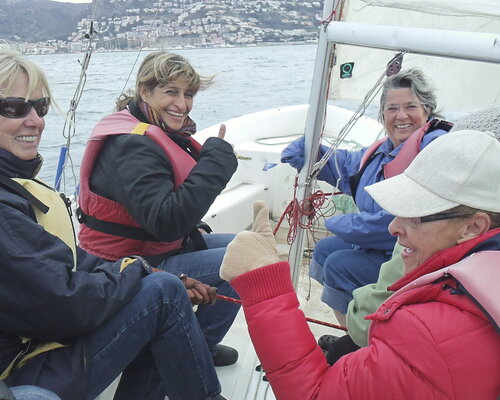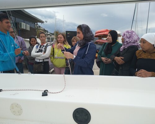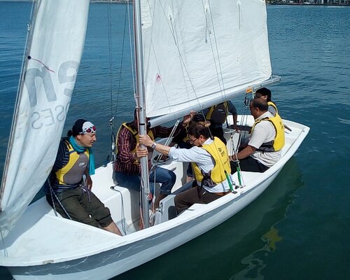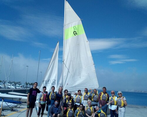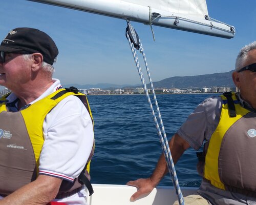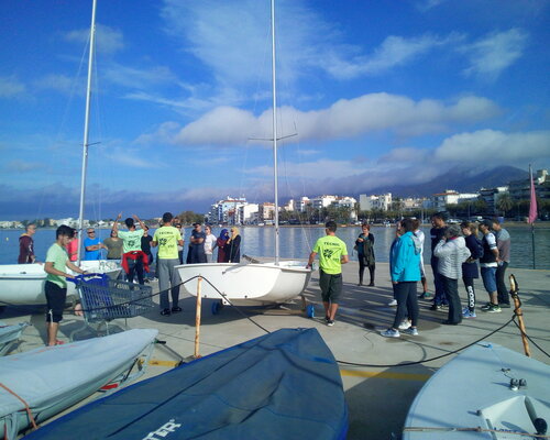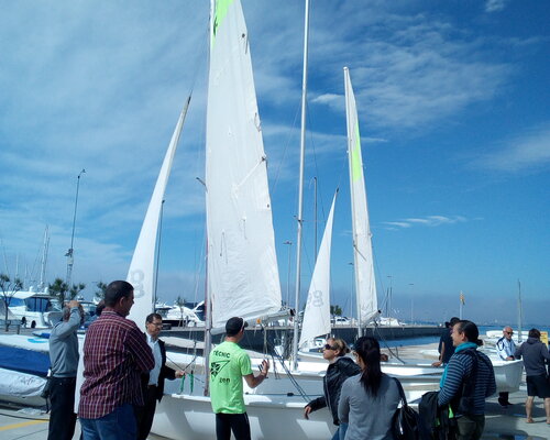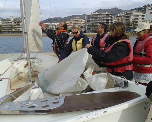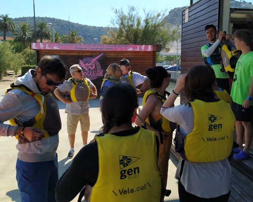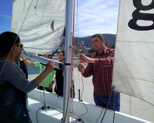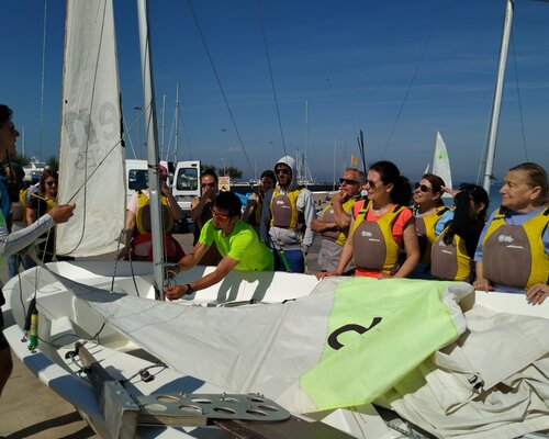 En la segona part d'aquests tallers, les persones participants ajuden a muntar i a preparar les barques de vela lleugera amb les quals, posteriorment, se surt a navegar per la badia de Roses, sempre que el temps ho permeti.
