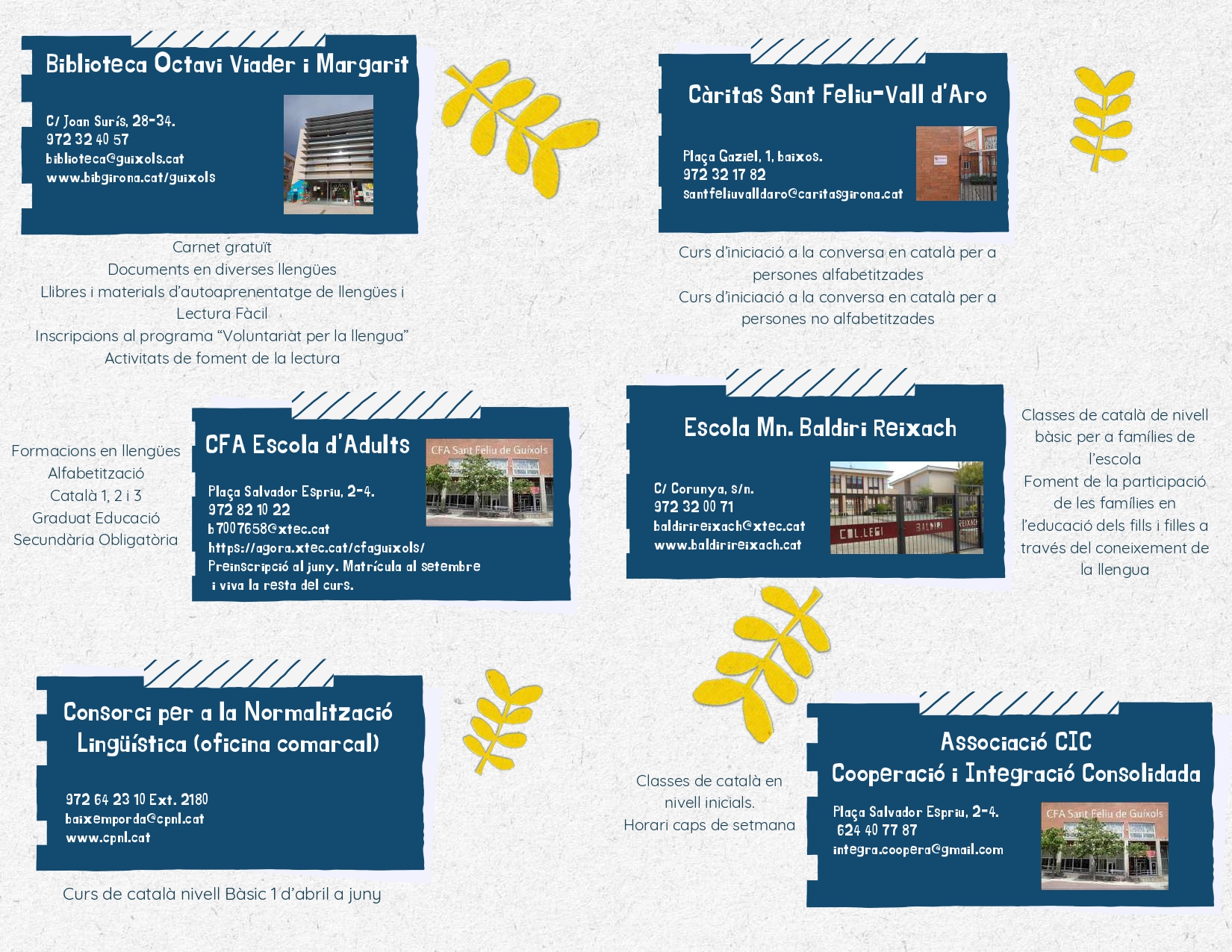 Biblioteca Octavi Viader i Margarit, Càritas Sant Feliu-la Vall d’Aro, CFA Escola d’Adults, Escola Mn. Baldiri Reixach, Associació CIC (Cooperació i Integració Consolidada)