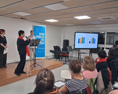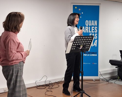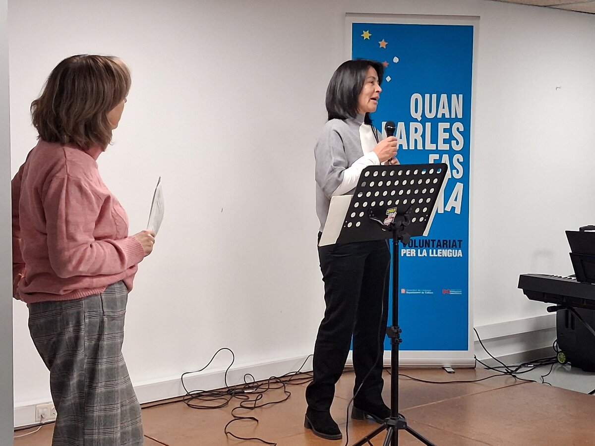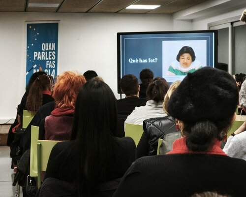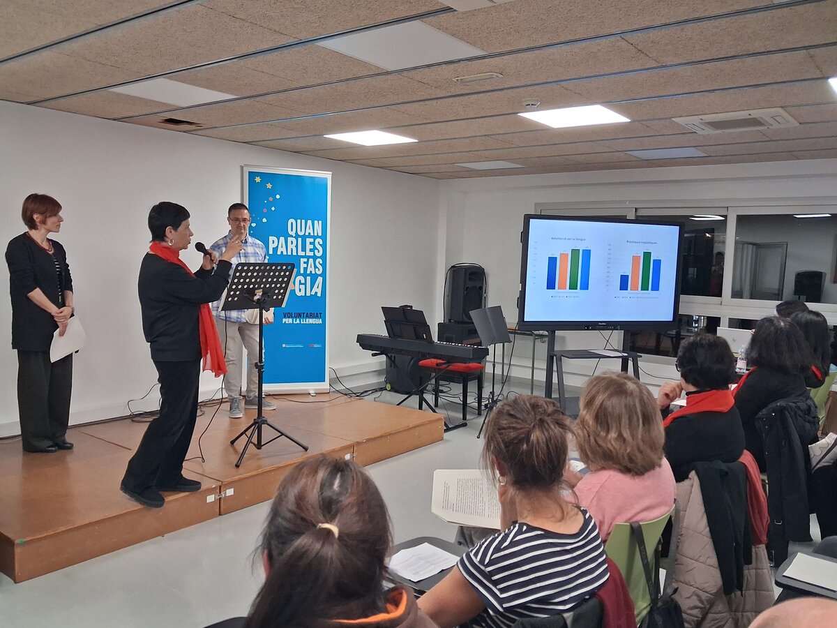 Després de donar la benvinguda per part de la presidenta del Consell de Centre, Blanca Padrós, es van explicar els èxits assolits i els reptes de futur del Voluntariat per la llengua, la Xarxa per la llengua i les pràctiques lingüístiques.