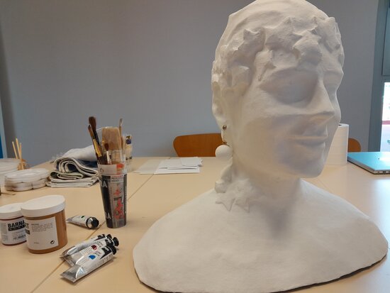 L'alumnat dels cursos de català comença a pintar el cap de la gegantona.