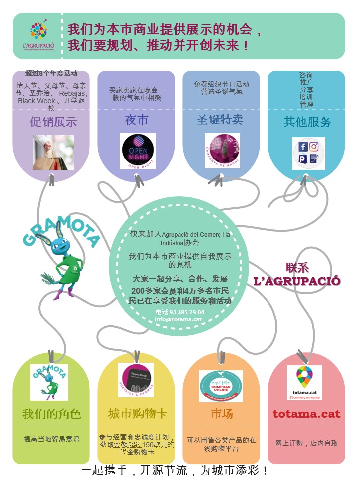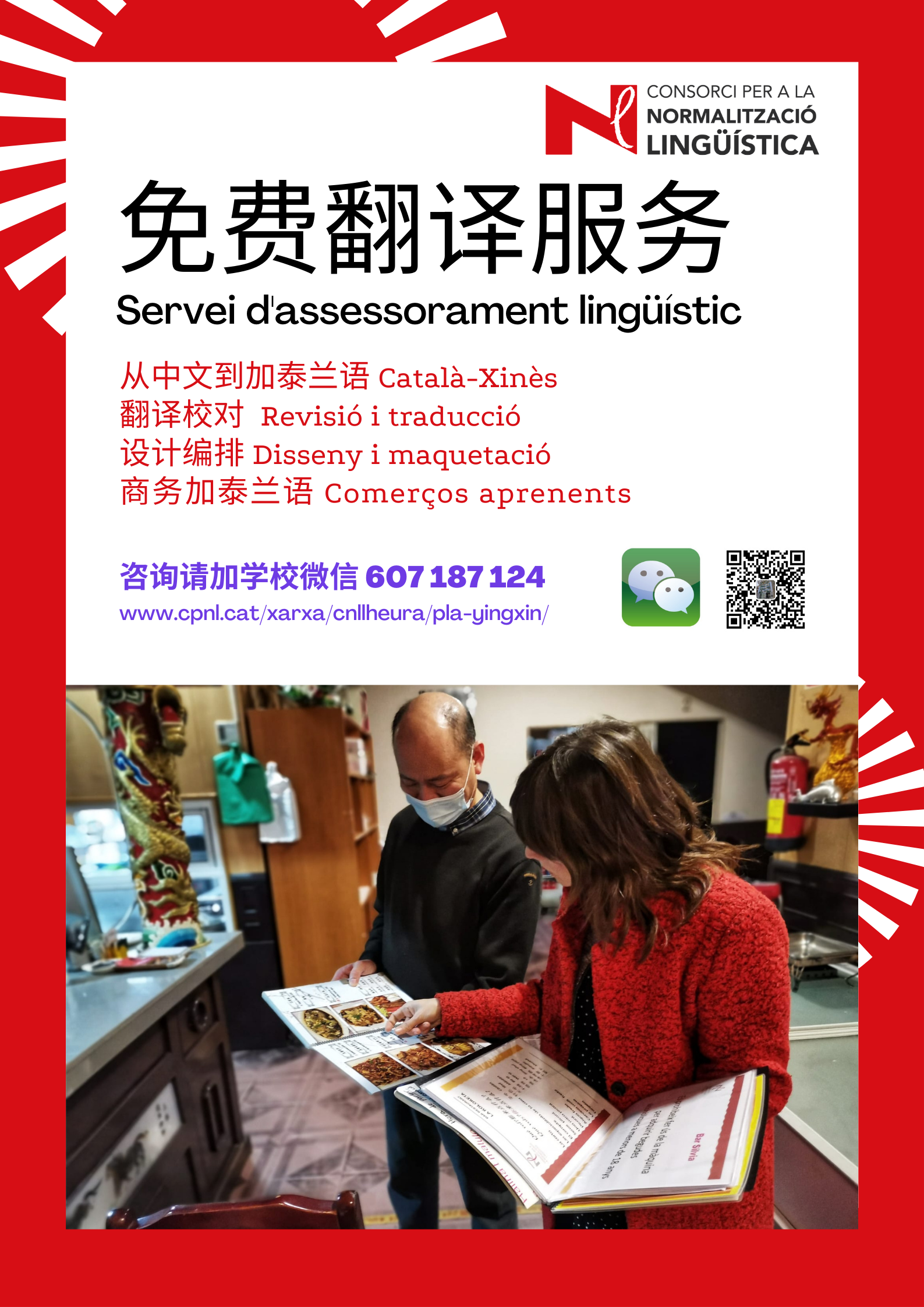 我们为 Santa Coloma 的店铺提供免费语言服务。怎么参与迎新计划?参与春节的准备和庆祝活动,在当地各个文化之间建立联系。通过文章、访谈、图像、标志等方式在我们的社交网络上展示自己。获得免费的语言咨询服务。无论什么合作活动都应当有助于推广加泰兰语,这是对参与者唯一的要求。参与方式: 通过微信(607 187 124)与我们联系。