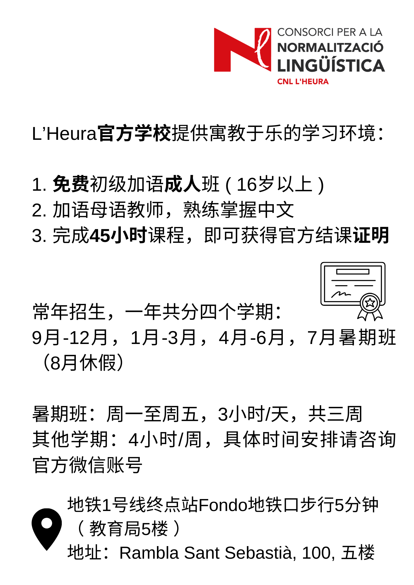语言标准化中心在整个加泰罗尼亚一共有22个官方学校,我们Santa Coloma de Gramenet的学校叫CNL L'Heura。本校多年推广迎新计划,旨在促进华人学习、了解和使用加泰罗尼亚语。我们在迎新计划做什么?
