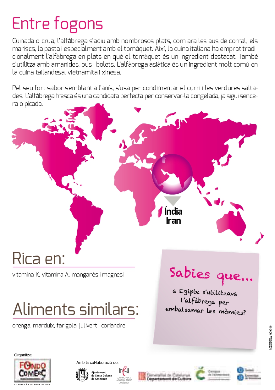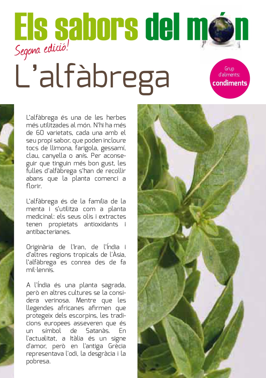 L'alfàbrega és una de les herbes més utilitzades al món. N'hi ha més de 60 varietats, cada una amb el seu propi sabor, que poden incloure tocs de llimona, farigola, gessamí, clau, canyella o anís. Per aconseguir que tinguin més bon gust, les fulles d'alfàbrega s'han de recollir abans que la planta comenci a florir.