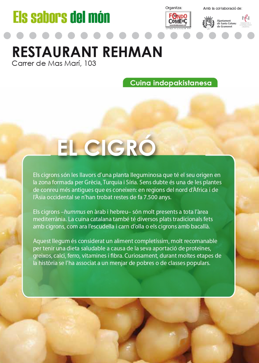 Els cigrons són les llavors d'una planta lleguminosa que té el seu origen en la zona formada per Grècia, Turquia i Síria. Sens dubte és una de les plantes de conreu més antigues que es coneixen: en regions del nord d'Àfrica i de l'Àsia occidental se n'han trobat restes de fa 7.500 anys. Els cigrons -hummus en àrab i hebreu- són molt presents a tota l'àrea mediterrània.
