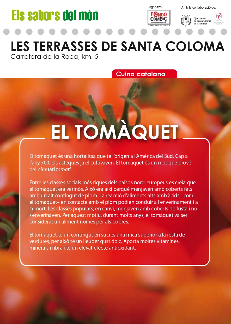 El tomàquet és una hortalissa que té l'origen a l'Amèrica del Sud. Cap a l'any 700, els asteques ja el cultivaven. El tomàquet és un mot que prové del nàhuatl tomatl. Entre les classes socials més riques dels països nord-europeus es creia que el tomàquet era verinós. Això era així perquè menjaven amb coberts fets amb un alt contingut de plom.