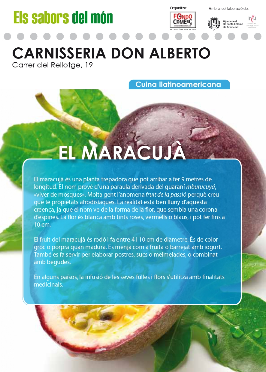 El maracujà és una planta trepadora que pot arribar a fer 9 metres de longitud. El nom prové d'una paraula derivada del guaraní mburucuyá, «viver de mosques». Molta gent l'anomena fruit de la passió perquè creu que té propietats afrodisíaques. La realitat està ben lluny d'aquesta creença, ja que el nom ve de la forma de la flor, que sembla una corona d'espines. La flor és blanca amb tints roses, vermells o blaus, i pot fer fins a 10 cm.