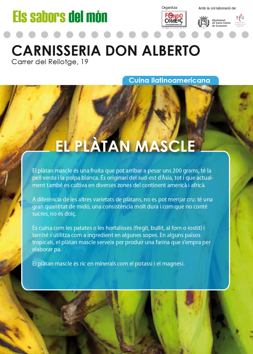 El plàtan mascle és una fruita que pot arribar a pesar uns 200 grams, té la pell verda i la polpa blanca. És originari del sud-est d'Àsia, tot i que actualment també es cultiva en diverses zones del continent americà i africà. A diferència de les altres varietats de plàtans, no es pot menjar cru: té una gran quantitat de midó, una consistència molt dura i com que no conté sucres, no és dolç.