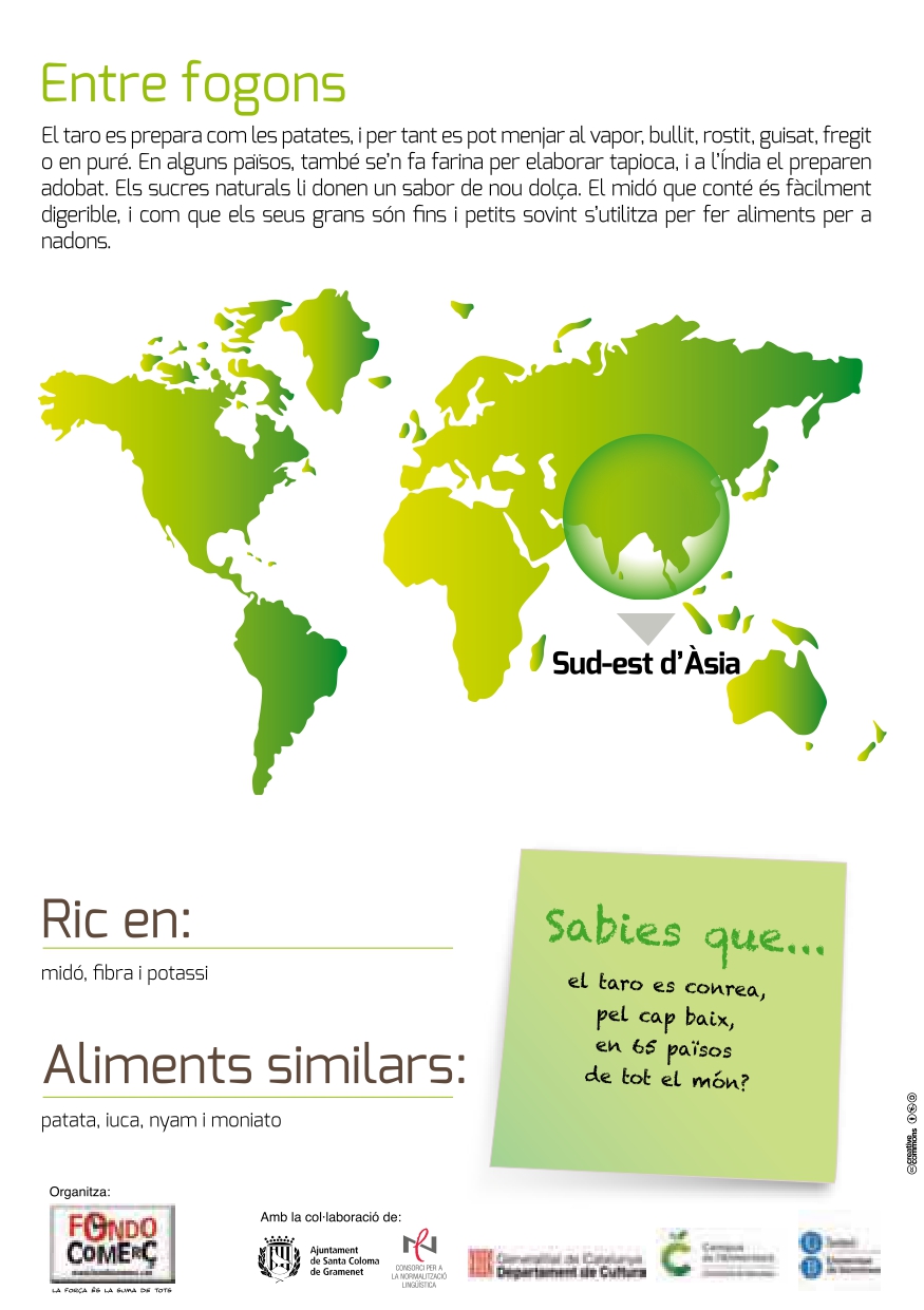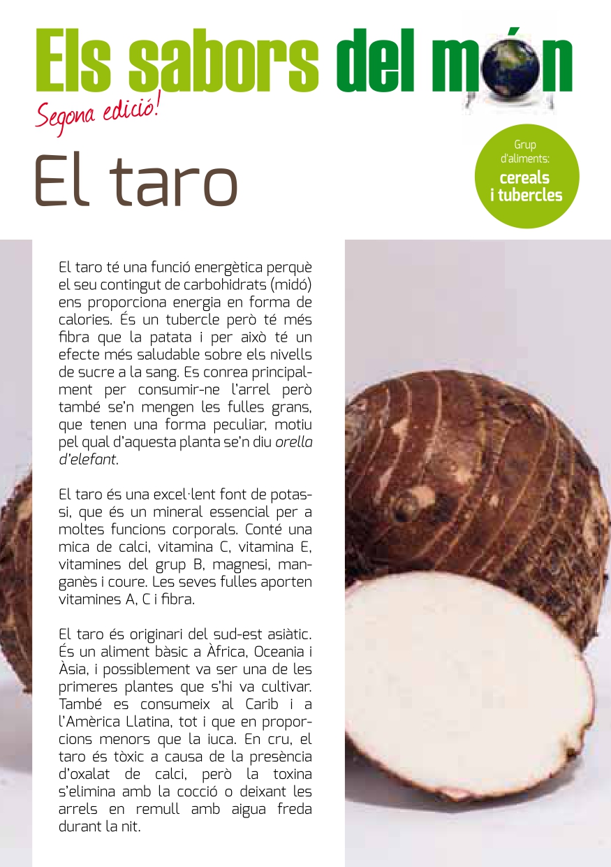 El taro té una funció energètica perquè el seu contingut de carbohidrats (midó) ens proporciona energia en forma de calories. És un tubercle però té més fibra que la patata i per això té un efecte més saludable sobre els nivells de sucre a la sang. Es conrea principalment per consumir-ne l'arrel però també se'n mengen les fulles grans, que tenen una forma peculiar, motiu pel qual d'aquesta planta se'n diu orella d'elefant.