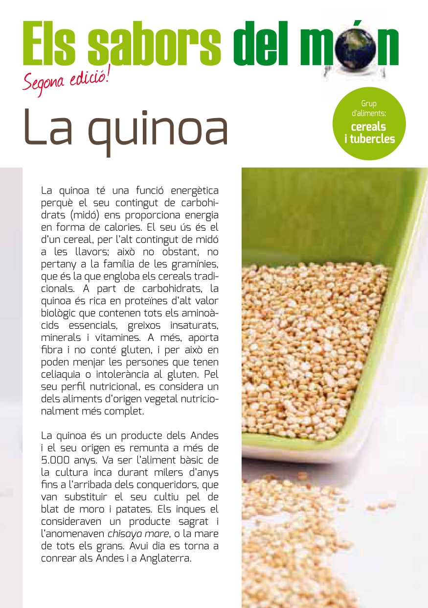 La quinoa té una funció energètica perquè el seu contingut de carbohidrats (midó) ens proporciona energia en forma de calories. El seu ús és el d'un cereal, per l'alt contingut de midó a les llavors; això no obstant, no pertany a la família de les gramínies, que és la que engloba els cereals tradicionals. A part de carbohidrats, la quinoa és rica en proteïnes d'alt valor biològic que contenen tots els aminoàcids essencials, greixos insaturats, minerals i vitamines. A més, aporta fibra i no conté gluten, i per això en poden menjar les persones que tenen celiaquia o intolerància al gluten. Pel seu perfil nutricional, es considera un dels aliments d'origen vegetal nutricionalment més complet.