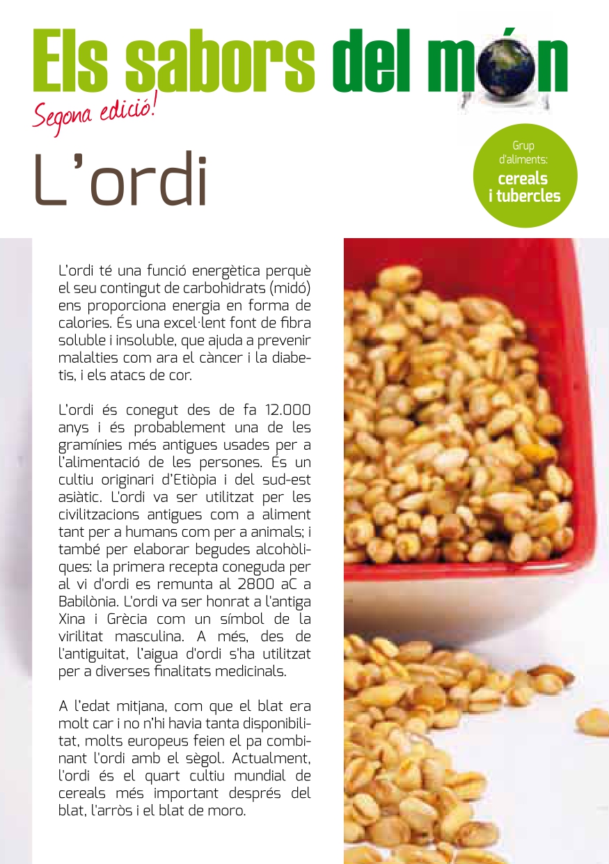 L'ordi té una funció energètica perquè el seu contingut de carbohidrats (midó) ens proporciona energia en forma de calories. És una excel·lent font de fibra soluble i insoluble, que ajuda a prevenir malalties com ara el càncer i la diabetis, i els atacs de cor. L'ordi és conegut des de fa 12.000 anys i és probablement una de les gramínies més antigues usades per a l'alimentació de les persones. És un cultiu originari d'Etiòpia i del sud-est asiàtic. L'ordi va ser utilitzat per les civilitzacions antigues com a aliment tant per a humans com per a animals; i també per elaborar begudes alcohòliques: la primera recepta coneguda per al vi d'ordi es remunta al 2800 aC a Babilònia