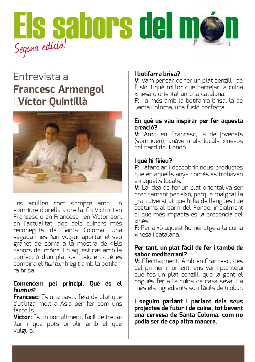 En Víctor i en Francesc o en Francesc i en Víctor són, en l'actualitat, dos dels cuiners més reconeguts de Santa Coloma. Una vegada més han volgut aportar el seu granet de sorra a la mostra de «Els sabors del món». En aquest cas amb la confecció d'un plat de fusió en què es combina el huntun fregit amb la botifarra brisa.