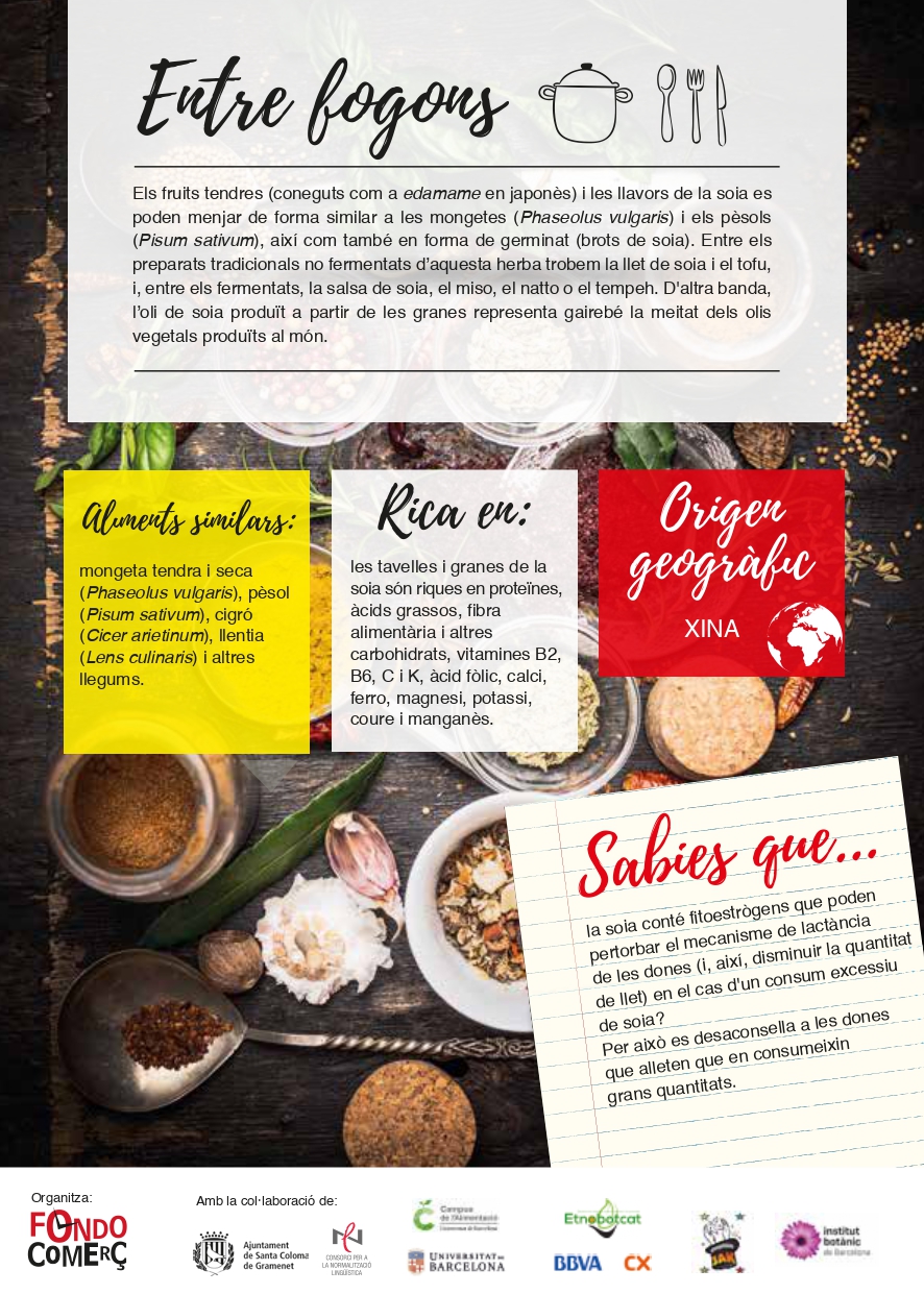 La soia és una planta herbàcia de la família de les fabàcies originària de l'est d'Àsia, molt consumida a la Xina, al Japó, a Corea i a Taiwan. Actualment es cultiva en gran quantitat a tota Àsia, als Estats Units i a l'Amèrica del Sud (Brasil, Argentina i Paraguai). La soia, als Països Catalans, és cultivada principalment a les Illes Balears. Aquesta planta sol créixer en horts i camps de cultiu, tot i que algunes de silvestres creixen en prats i estepes.
