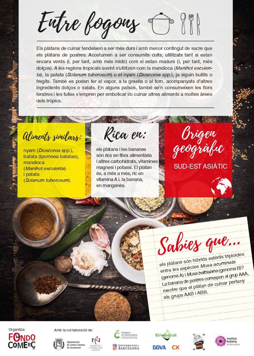 Herba robusta i perenne amb rizomes subterranis carnosos i fulles molt llargues. Les varietats cultivades són estèrils i desenvolupen els seus fruits sense necessitat de pol·linització. Els plàtans de cuinar pertanyen al mateix grup botànic que la banana o el plàtan de postres, però normalment són variants triploides. Tots els membres del gènere Musa són originaris de les regions tropicals del sud-est asiàtic i d'Oceania.