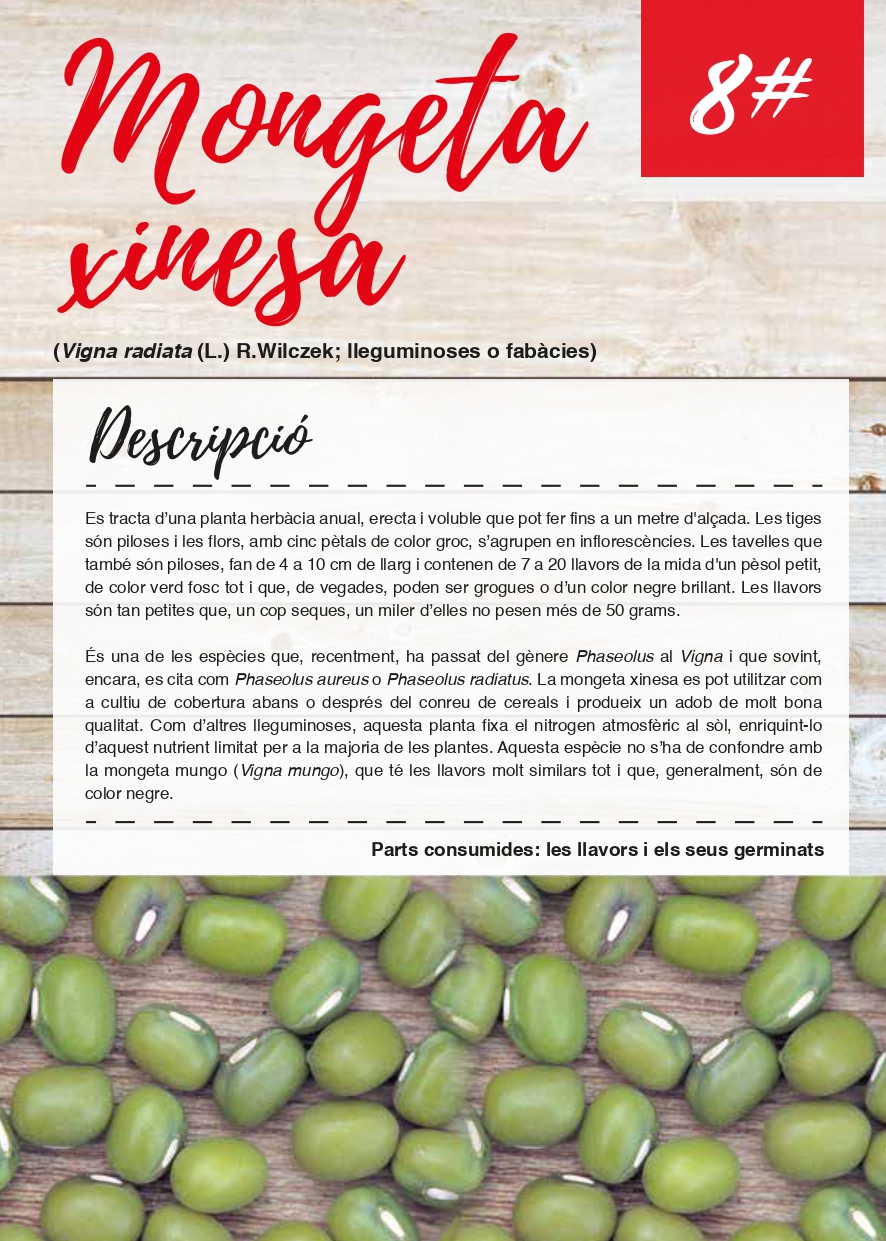 Es tracta d'una planta herbàcia anual, erecta i voluble que pot fer fins a un metre d'alçada. Les tiges són piloses i les flors, amb cinc pètals de color groc, s'agrupen en inflorescències. Les tavelles que també són piloses, fan de 4 a 10 cm de llarg i contenen de 7 a 20 llavors de la mida d'un pèsol petit, de color verd fosc tot i que, de vegades, poden ser grogues o d'un color negre brillant. Les llavors són tan petites que, un cop seques, un miler d'elles no pesen més de 50 grams.