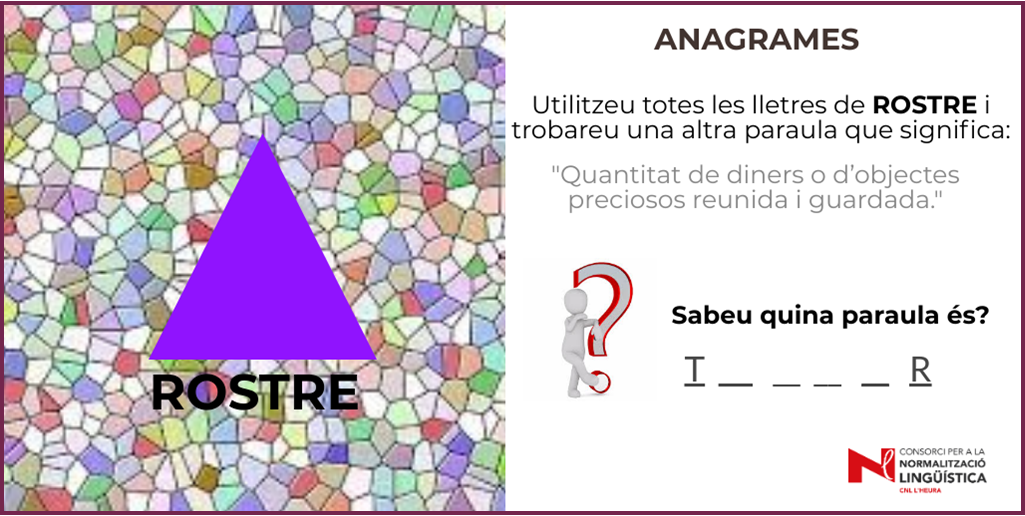 Utilitzeu totes les lletres de la paraula rostre i en trobareu una altra que significa “quantitat de diners o d’objectes preciosos reunida i guardada”.