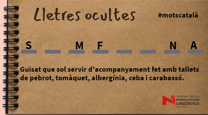 Sabeu quines són les lletres que falten per formar la paraula que vol dir “guisat que sol servir d’acompanyament fet amb tallets de pebrot, tomàquet, albergínia, ceba i carabassó”?