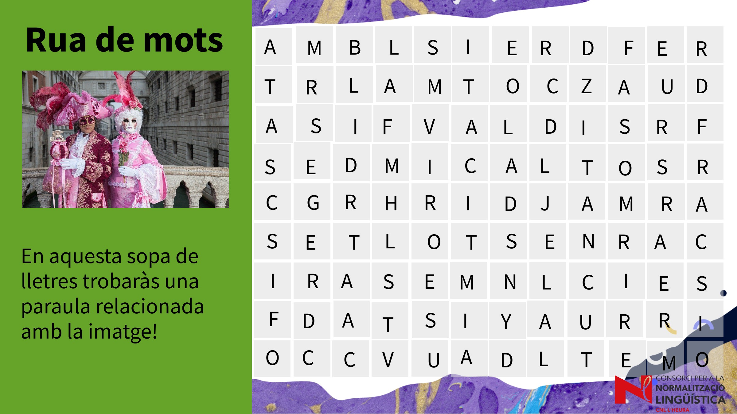 Rua de mots ens proposa descobrir paraules relacionades amb la imatge que acompanya la sopa de lletres. Febrer 2022