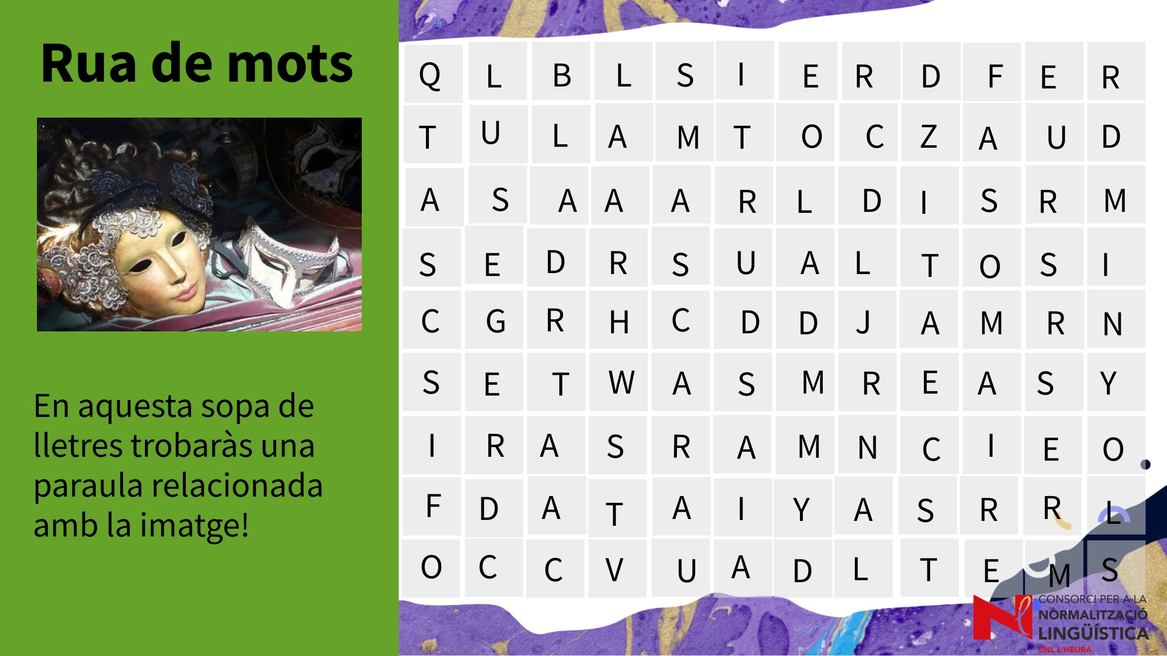 Rua de mots ens proposa descobrir paraules relacionades amb la imatge que acompanya la sopa de lletres. Febrer 2022