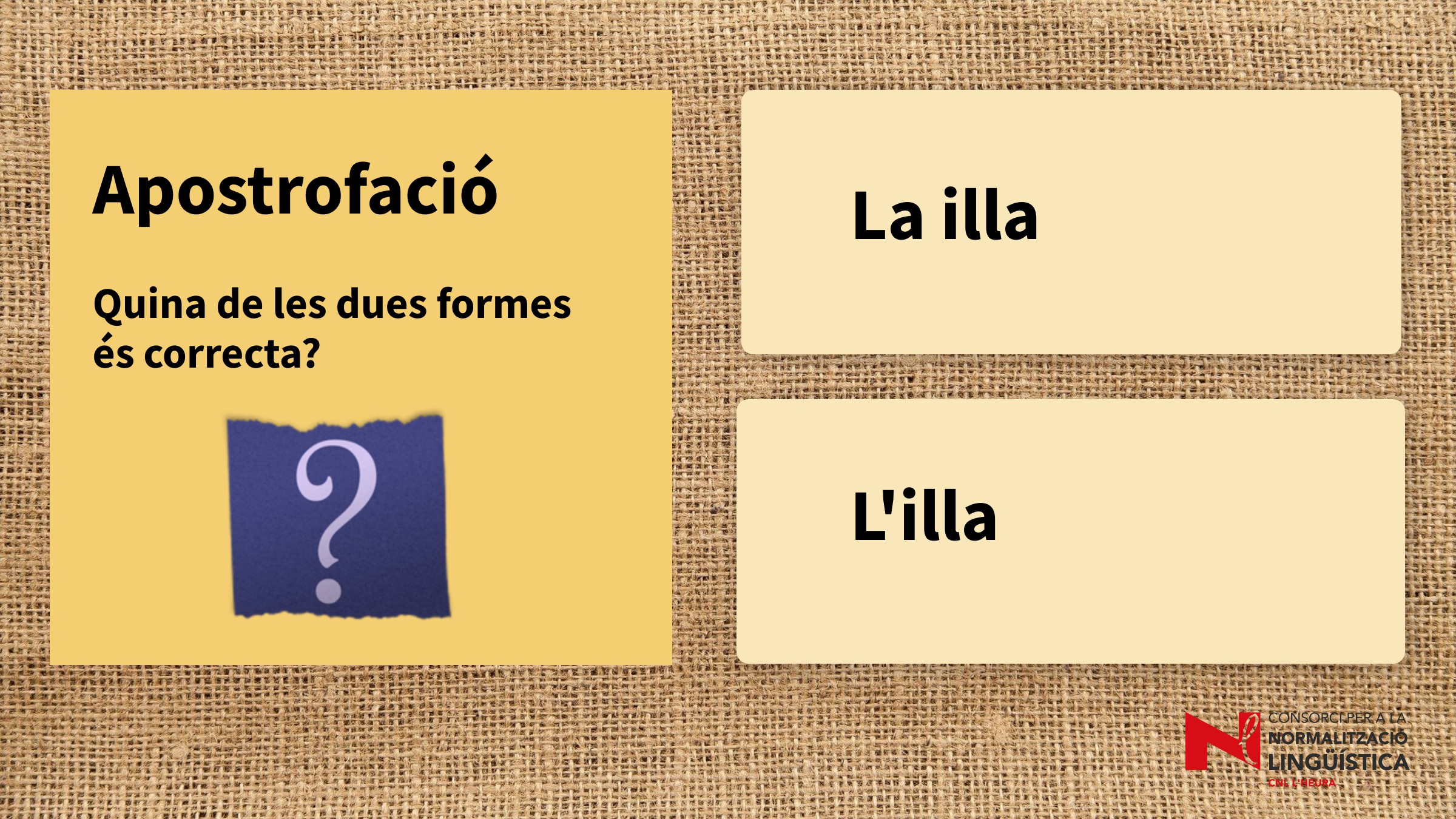 En aquest joc de llengua heu de triar la forma correcta de les dues proposades: amb apòstrof o sense.