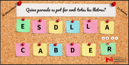 ""El joc de les dotze lletres" ens convida a descobrir quina paraula s'amaga darrere les dotze lletres desordenades. Forma part d'una campanya de comunicació, a les xarxes socials del CNL L'Heura, feta el desembre de 2021.